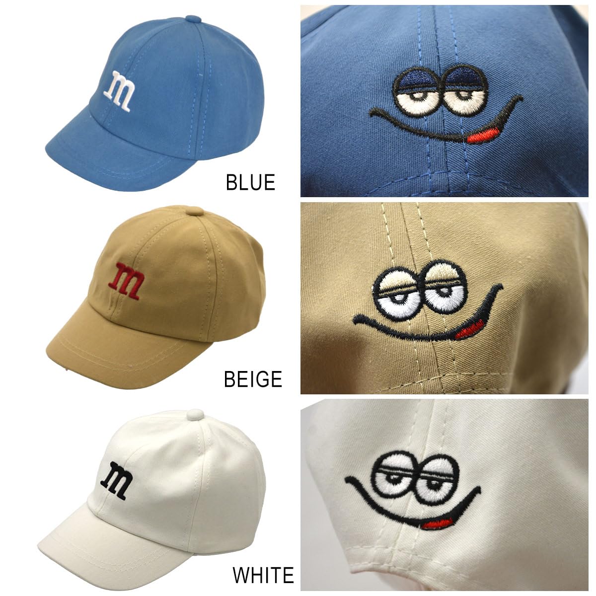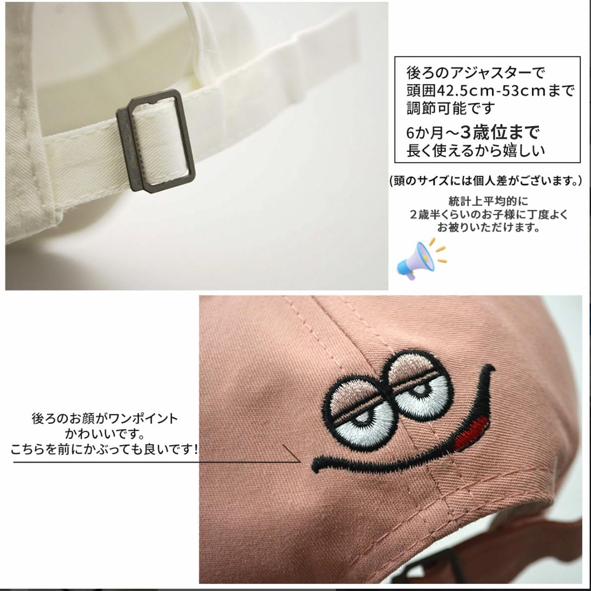 シンプルな刺繍ロゴのキャップは、オールシーズン活躍するアイテムです。コットン素材で肌触りが良く、通気性に優れています。アジャスター付きなので、頭囲42cm〜50cmまでの幅広い年齢層に対応。お子様の成長に合わせて長くご利用いただけます。シンプルなデザインなので、様々なスタイリングに合わせやすく、飽きのこない1つを持っていると重宝します。可愛い刺繍の顔がアクセントになり、逆さにかぶってもおしゃれに決まります。洗濯も手洗いがおすすめで、お手入れも簡単です。 1歳から2歳半くらいの子が統計的にちょうどいいです。