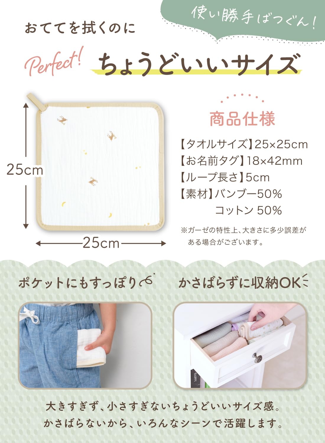 【園の指定もクリア!保育園にぴったり】保育園や幼稚園で必須のハンドタオル。使いやすいようこだわりました!マジックで書いてもにじみにくいネームタグ付き♪ループ部分もお子さまの小さな手でひっかけやすい大きさです。ポッケにもすっぽり入るので保育園にもぴったり♪