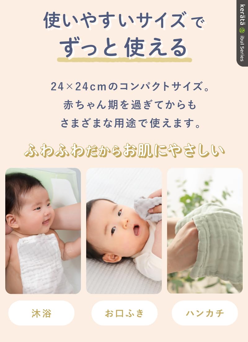 【沐浴期が終わってもずっと使える!】ふわふわで柔らかいので、赤ちゃんのお肌にも安心。お口ふきハンカチとしても大活躍です。沐浴期が終わってもずっとお使いいただけます。