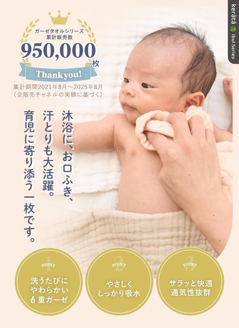 【綿100%&蛍光増白剤不使用】ふんわりやさしい6重ガーゼ。大切な赤ちゃんに使うものだから、柔らかく心地よい肌ざわりにこだわりました。産後で敏感になっているママのお肌にもお勧め。家族みんなでお使いいただけます。素材は、もちろん綿100%。ホワイトも蛍光増白剤を使っていない自然なカラーなので安心してお使いいただけます。