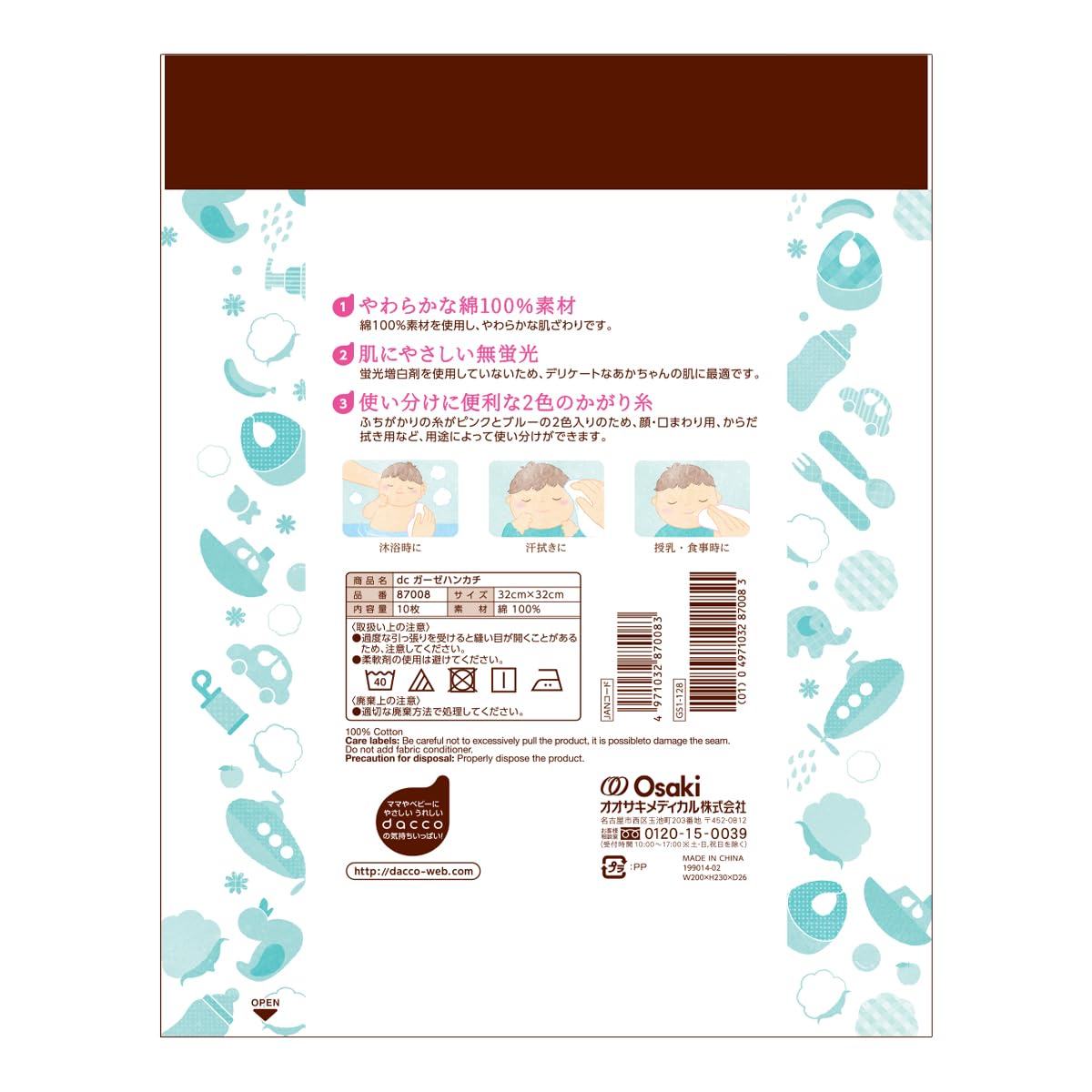 dacco(ダッコ) ガーゼハンカチ 10枚入 無蛍光 綿100% 87008 デリケートな肌にやさしいガーゼハンカチ ●ソフトな綿100% ●あかちゃんの肌にもやさしい無蛍光 ●多用途に使用可能 沐浴時に ●吸水性に優れたソフトな肌触りです。●蛍光増白剤不使用のため、デリケートな肌や赤ちゃんにも使用できます。