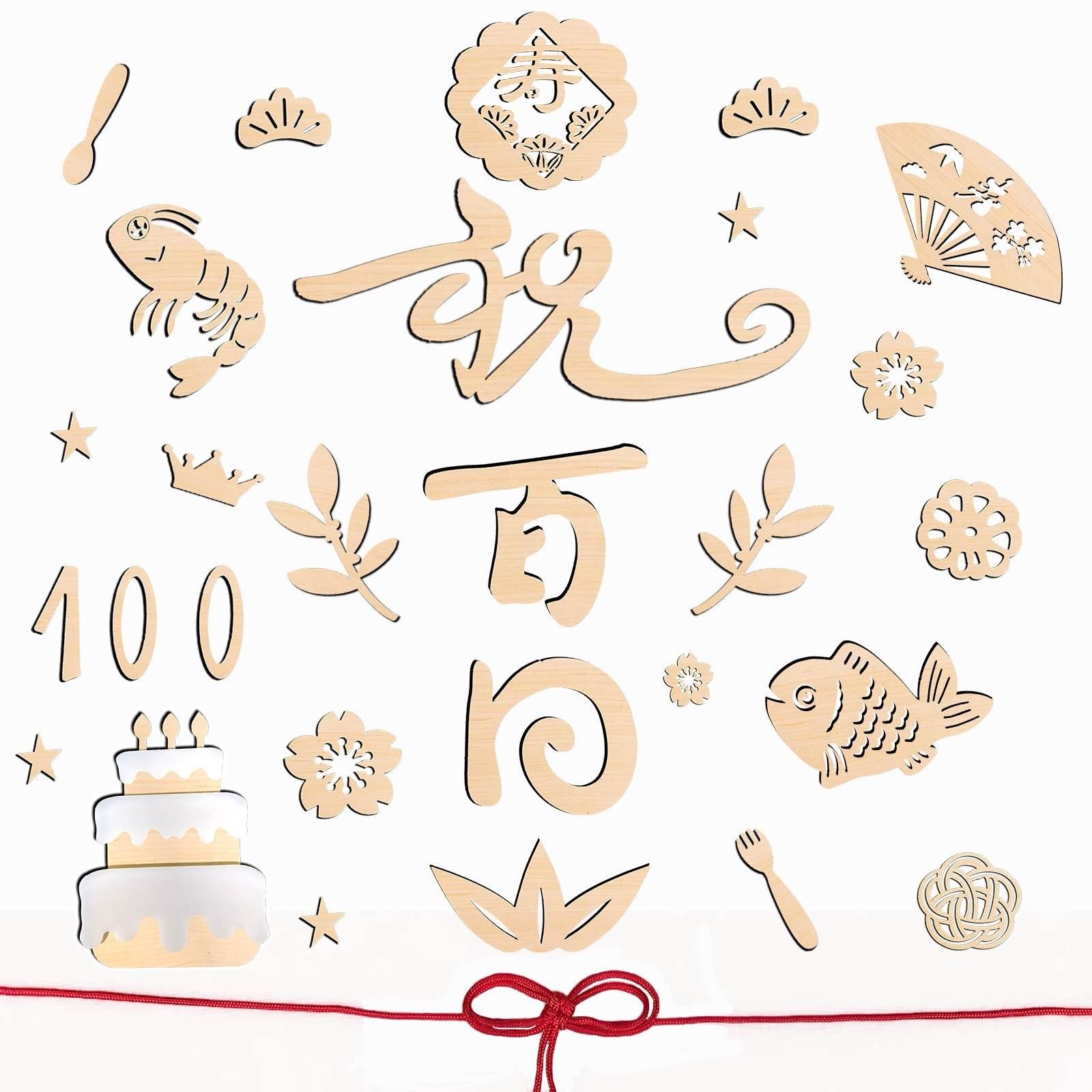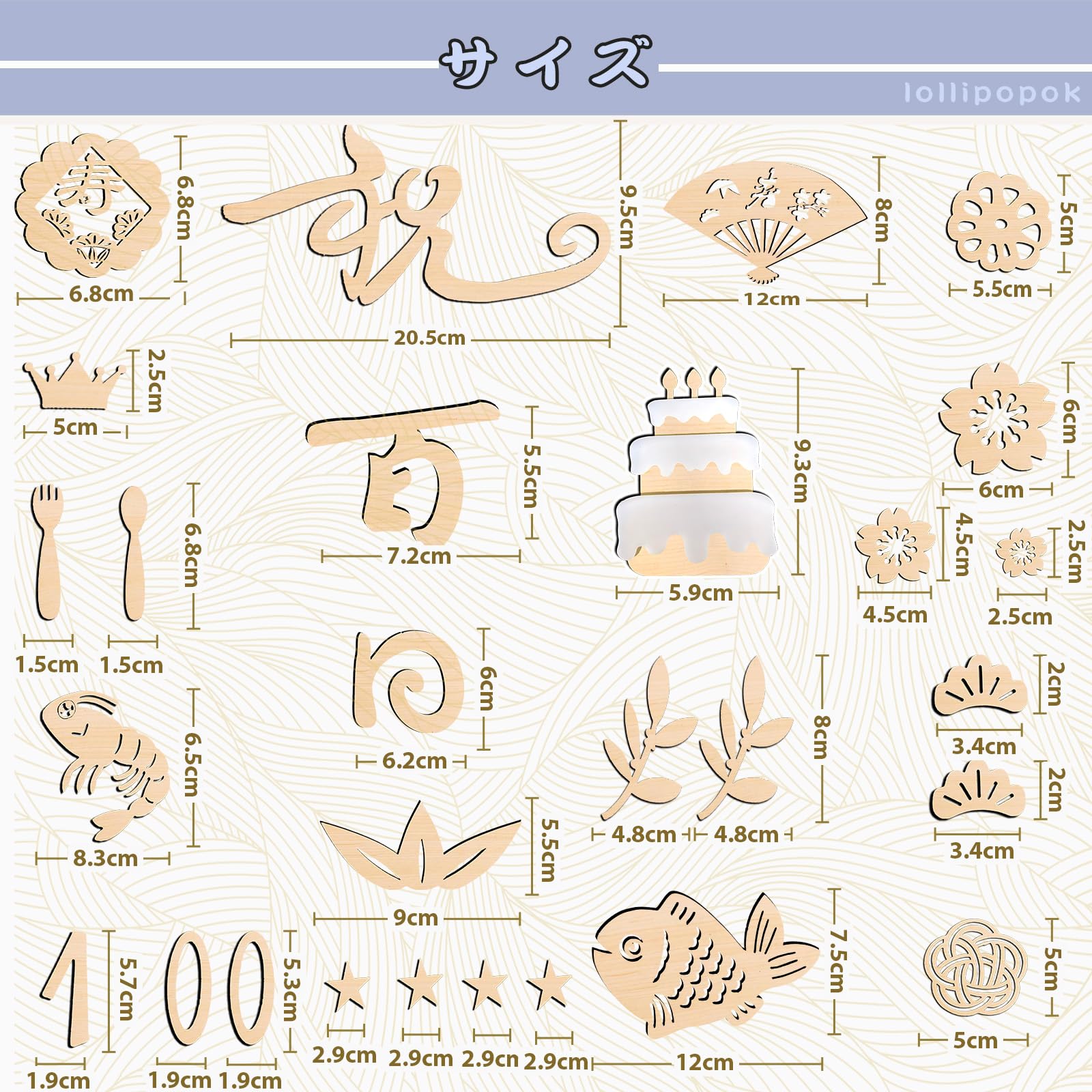 【セット内容】合計29枚:祝、百、日、各1枚、魚*1枚、桜*3枚、寿*1枚、エビ*1枚、ケーキ*1枚、王冠*1枚、梅結び*1枚、扇子*1枚、松の葉*2枚、蓮根*1枚、竹の葉*1枚、数字1*1枚、数字0*2枚、フォーク*1枚、スプーン*1枚、葉*2枚、星*4枚、赤の紐*1枚。厚さ約3mm。