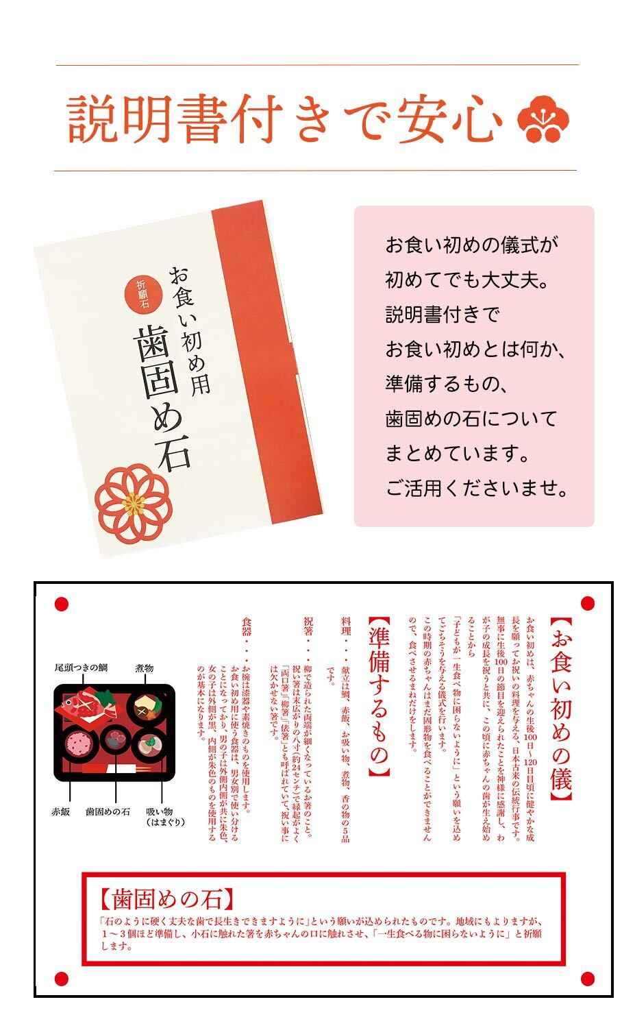 歯固めの儀式の方法がわかりやすい説明書もつけました。お食い初めの儀式とは何か、準備するもの、歯固めの石についてまとめています。儀式の際にご活用くださいませ。