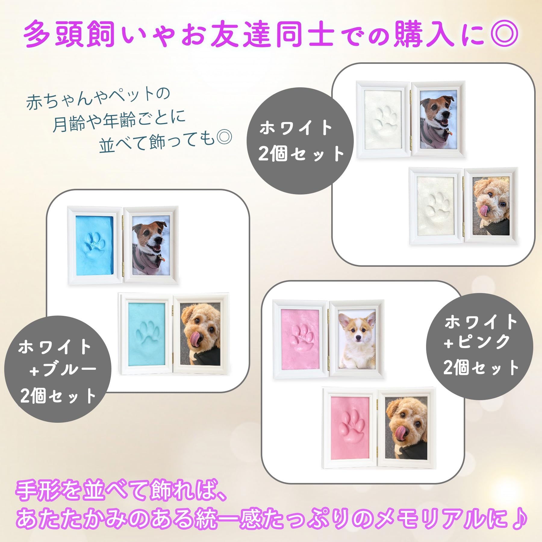 このフォトフレームは、赤ちゃんの手形やペットの肉球など、大切な成長の記録を形として残せる犬 手形 キットです。付属の軽くて柔らかい粘土は扱いやすく、初めての方でもきれいに型が取れます。フレームは白・青・ピンクの3色展開で、お部屋のインテリアに合わせてお選びいただけます。