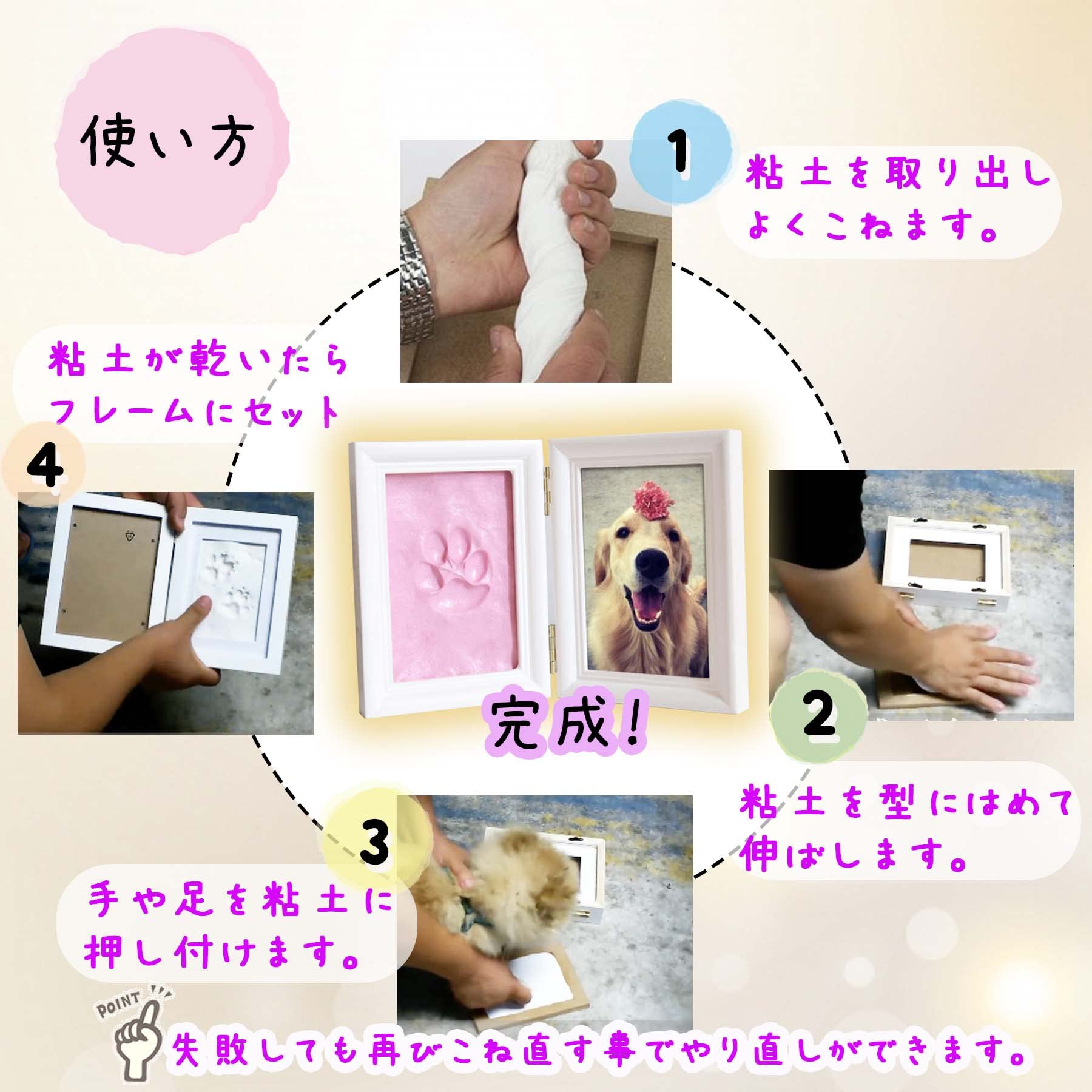 フレームサイズは幅23cm、高さ15cm。粘土は約100g入りで、両手や両足分の型取りに十分な量があります。犬 足跡を記録することで、可愛い成長の瞬間をいつでも振り返ることが可能。乾燥後も形が長く保てるため、思い出の品として重宝します。