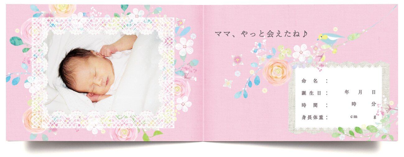 メッセージや命名、誕生日なども残せるページ付き。母子手帳と一緒に残せるコンパクトなサイズです。