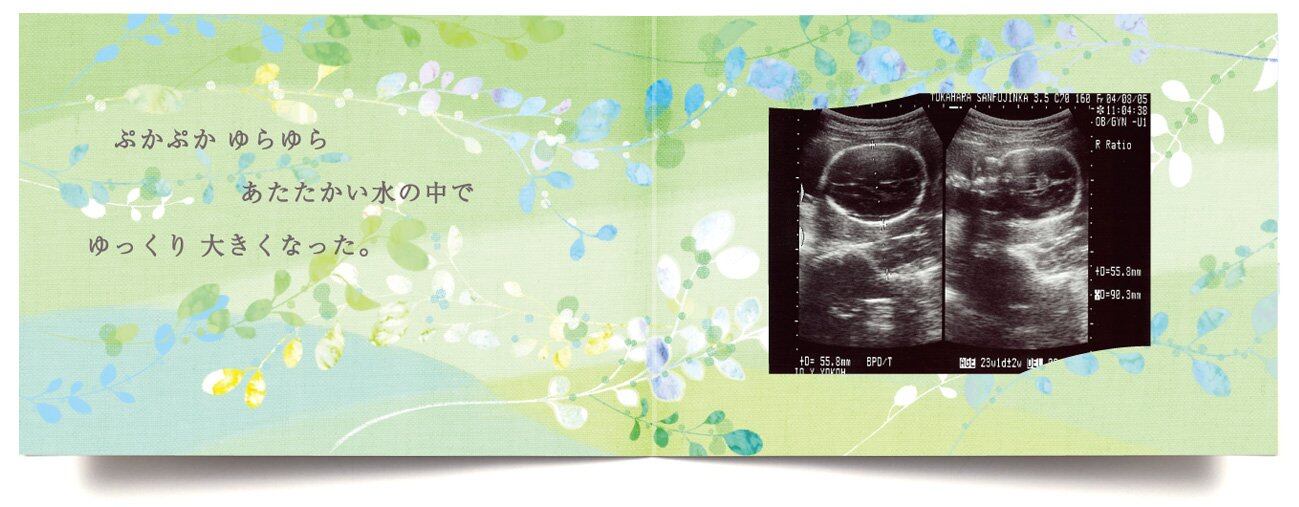 10ツキ10カものがたりは、エコー写真が入るおはなし付のアルバムです。誕生の写真2枚とエコー写真5枚が入るアルバムは、お腹の赤ちゃんがママに話しかけるストーリー。母子手帳ケースに入るサイズの絵本は、エコー写真の整理やご懐妊のプレゼントにもオススメです。