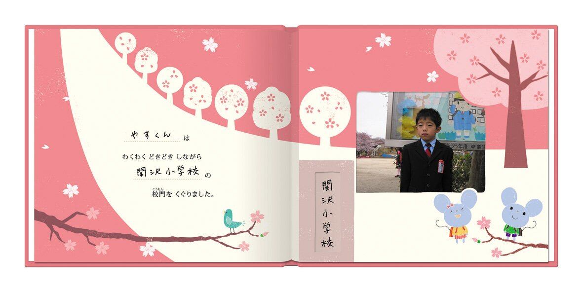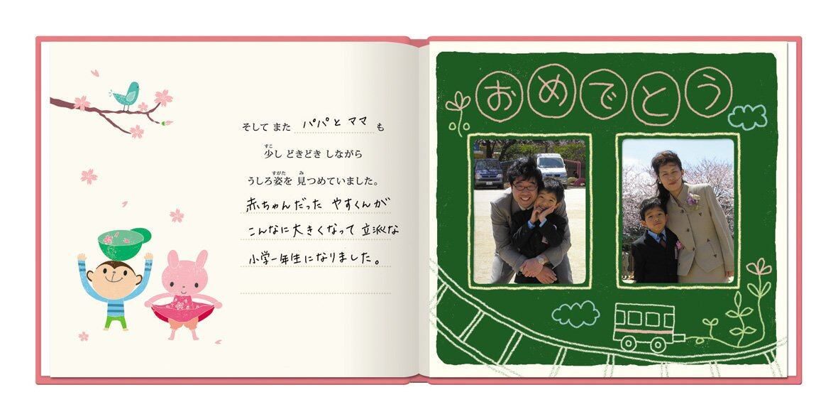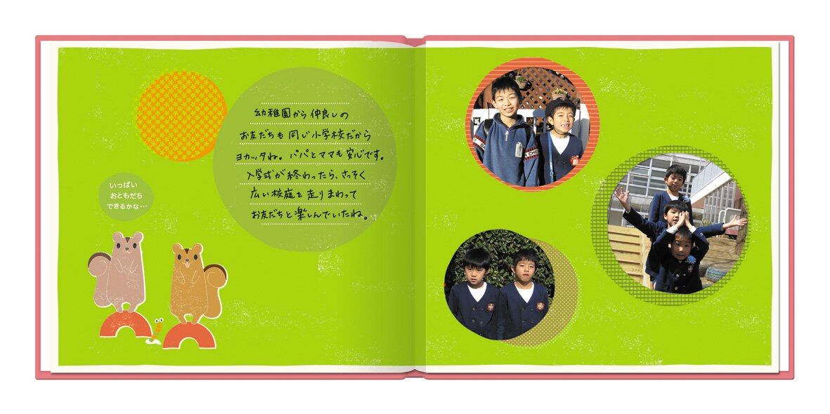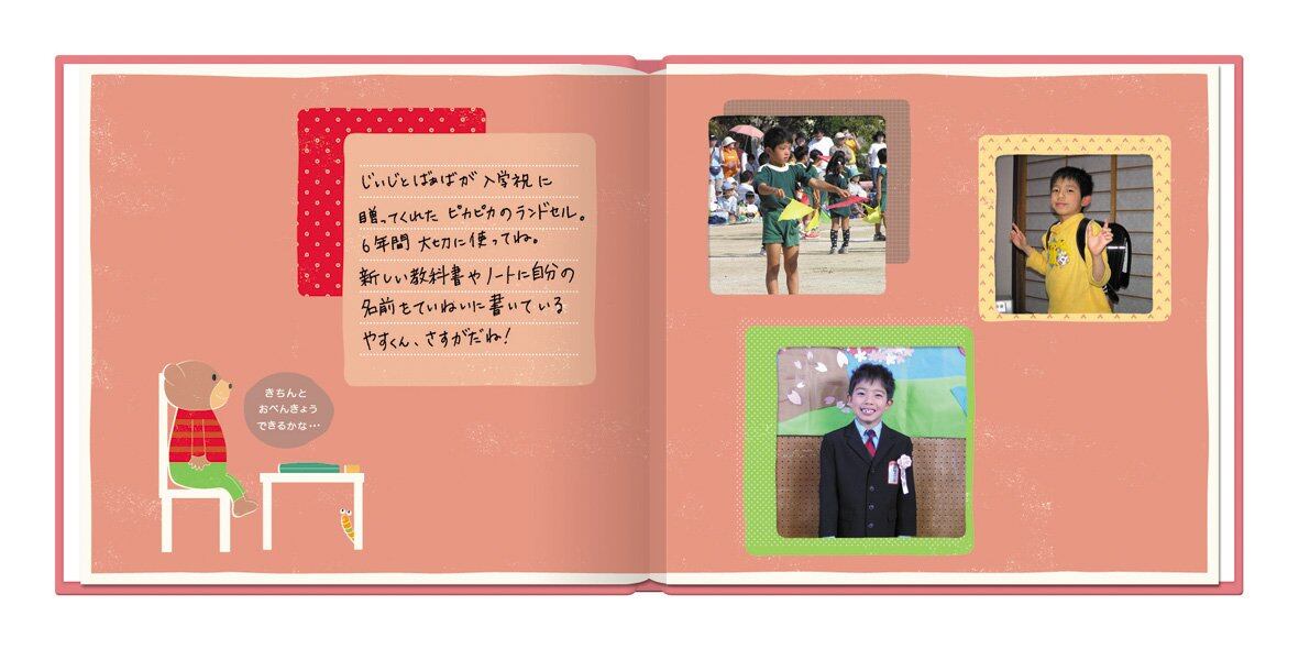 晴れの日の記録を自分で残せる! 記念 写真貼り付け・書き込み式のオリジナルブック。入学式の様子と当時のプロフィール、夢やご両親からのメッセージを残せます。