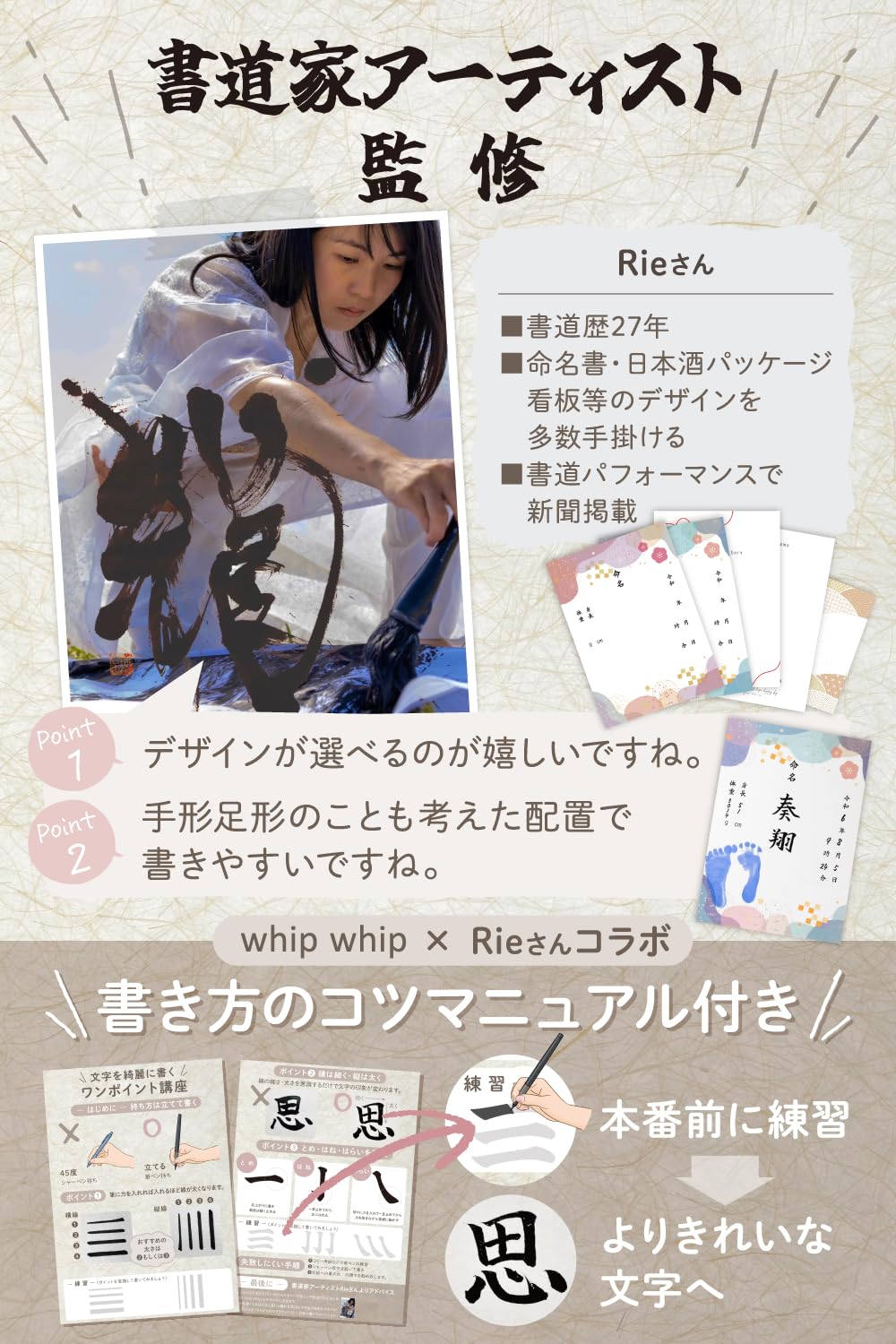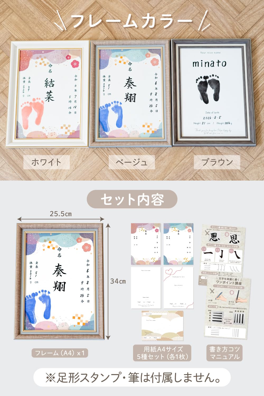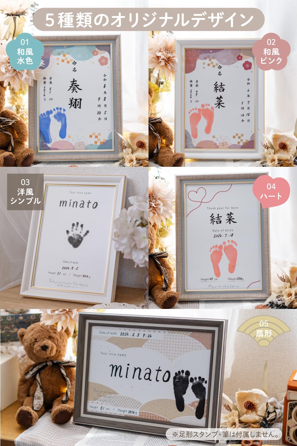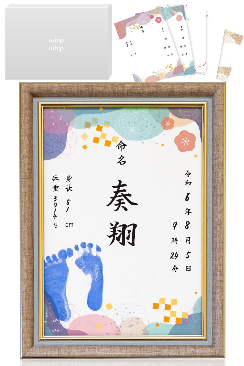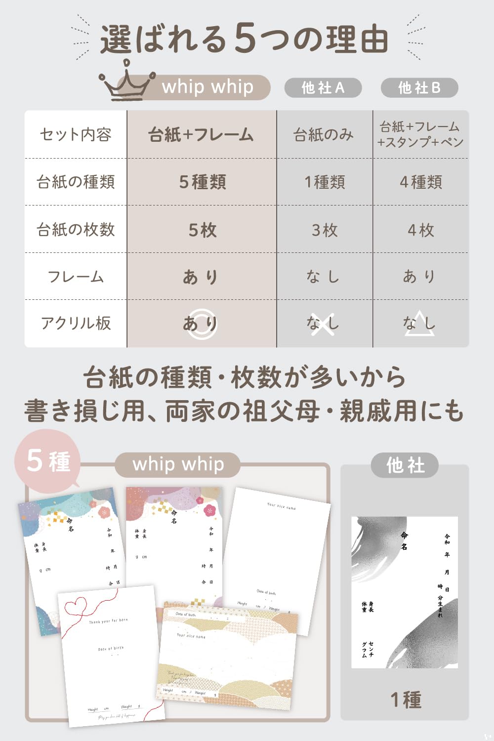whipwhip 命名書 男の子 女の子 シンプル 命名紙 用紙 5種類 (ベージュ) 【オリジナル台紙】男の子 女の子 問わずお使い頂けるデザインに。 5枚の用紙は、書き存じ用に多めに。余った分はご両家にお渡し頂けます。 【にじみにくい用紙】文字が滲みにくい用紙を採用 セット内容: フレーム x1、オリジナル台紙x5 、説明書x1 ※手形スタンプ、筆ペンは別途。用紙は印字、代筆品ではございませんので、お客様にてお子様のお名前を用紙にご記入ください。
