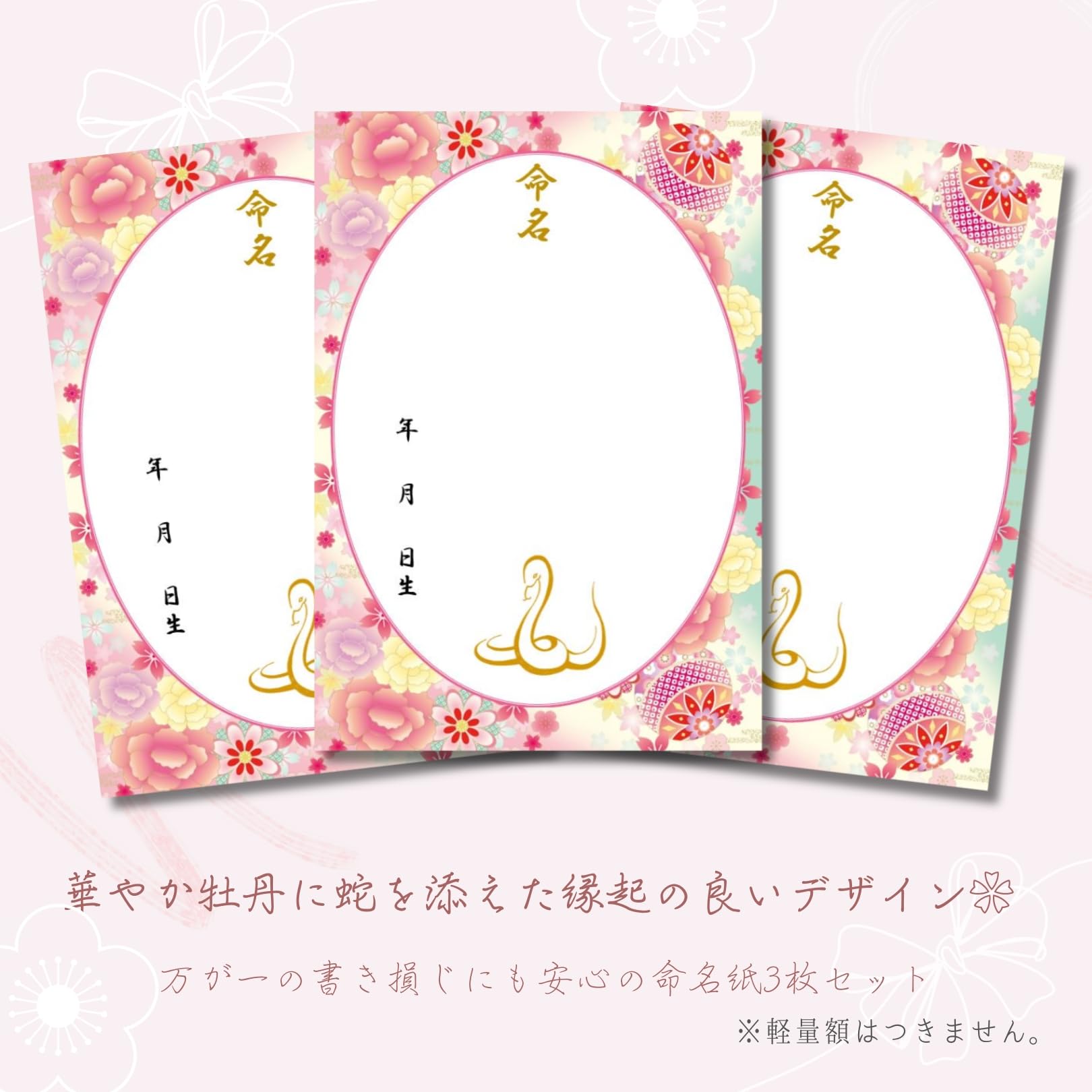 《命名紙3枚セット》毬と牡丹 桃色 令和7年(2025年)干支 巳入り A4和風命名用紙 万が一の書き損じにも安心の3枚入 額なし 優しいパステルカラー 令和7年生まれのお子様にぴったりな干支の蛇入りデザイン 命名書 命名紙 お七夜 出産祝い 命名式 縁起の良い毬と牡丹 ご縁を結ぶリボンが華やかな命名用紙 日本製 MMS110-T