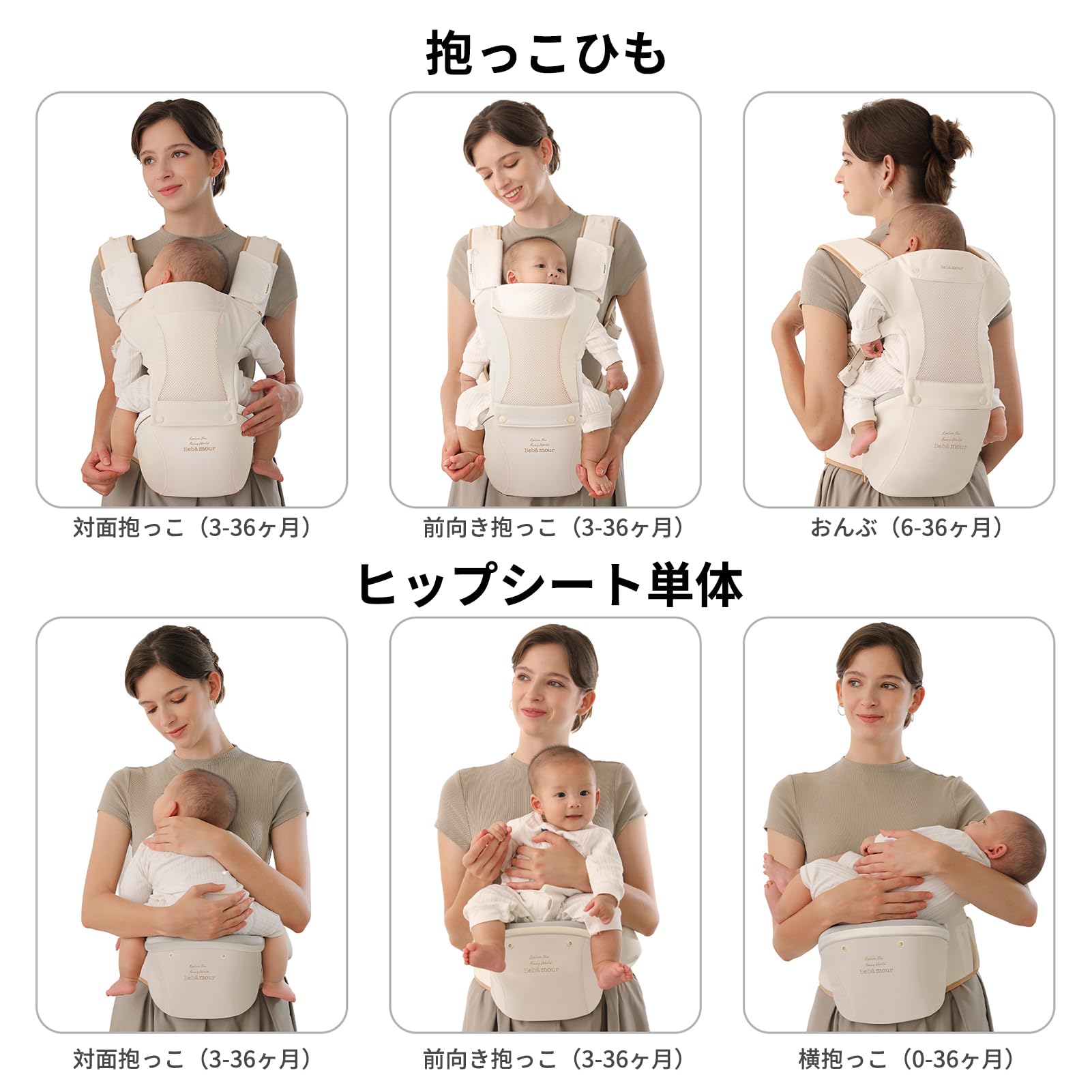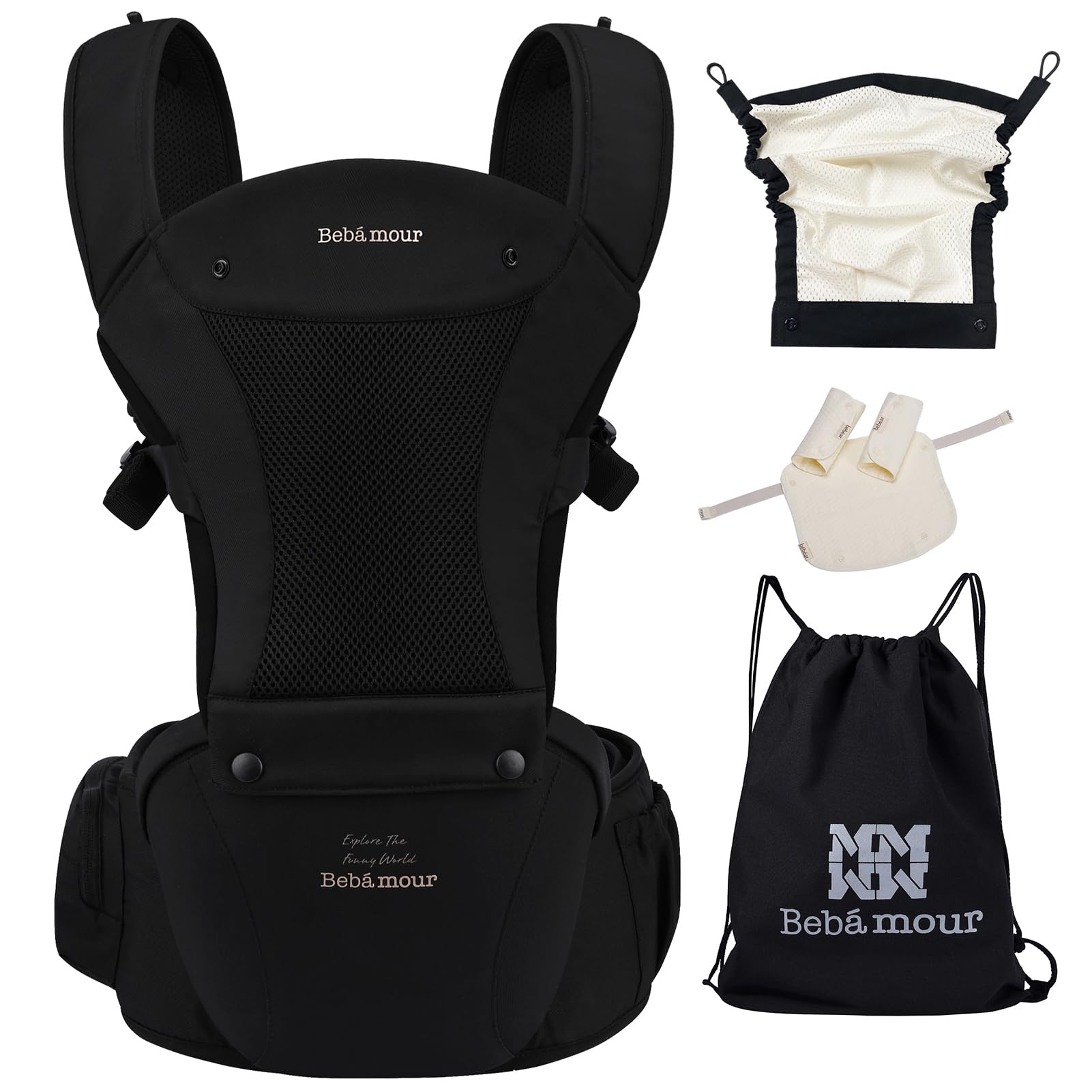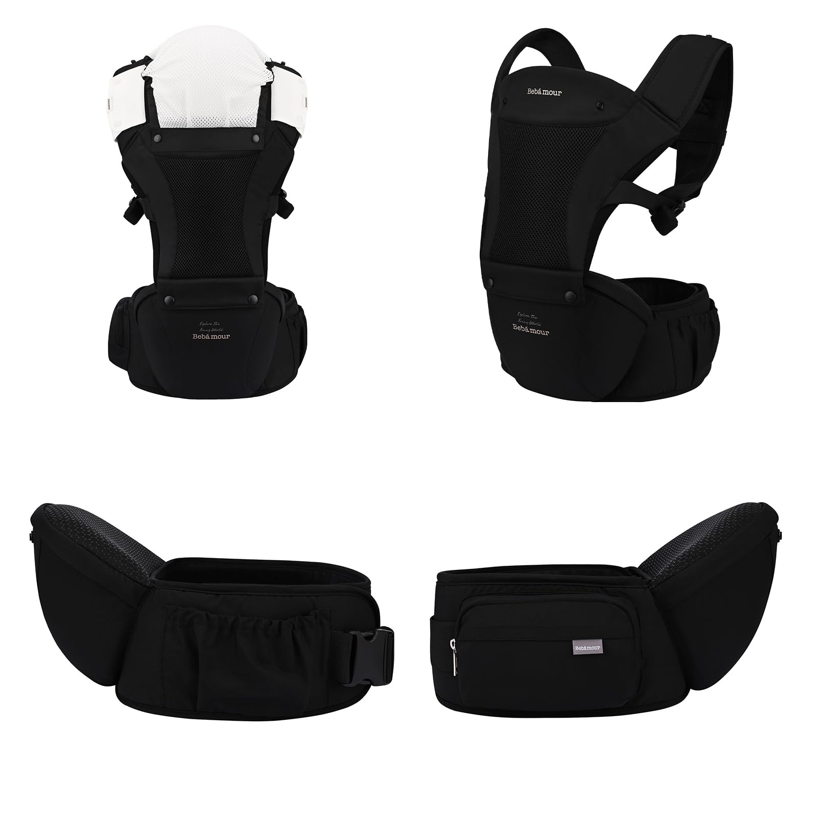 【ベビーアムール】Bebamour 抱っこひも ヒップシート 軽量 通気メッシュ ベビーキャリア 前向き抱っこ おんぶ 6way ウェストキャリー 快適(黒)
