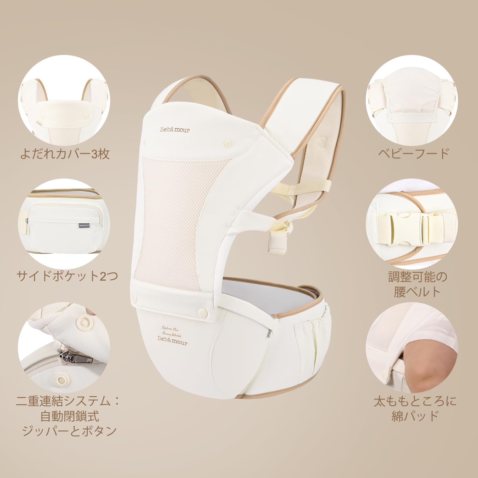 [特徴]★取り外せるよだれカバー3枚。★引っかけ式ベビーフード。★メッシュタイプのフロントカバー、通気性と透湿性に優れます。★上下部分にはボタン式ファスナーと自動閉鎖式ジッパーという二重連結システムが設計します。★H型両肩ストラップ、肩紐の滑ることが防止できます。★携帯、おつり、ティッシュなどの小物を収納するサイドポケット。★メッシュタイプの肩紐と腰ベルト。ほかに、肩と腰、お腹部分にはスポンジが入って、長時間装着しても蒸し暑くなくて快適です。