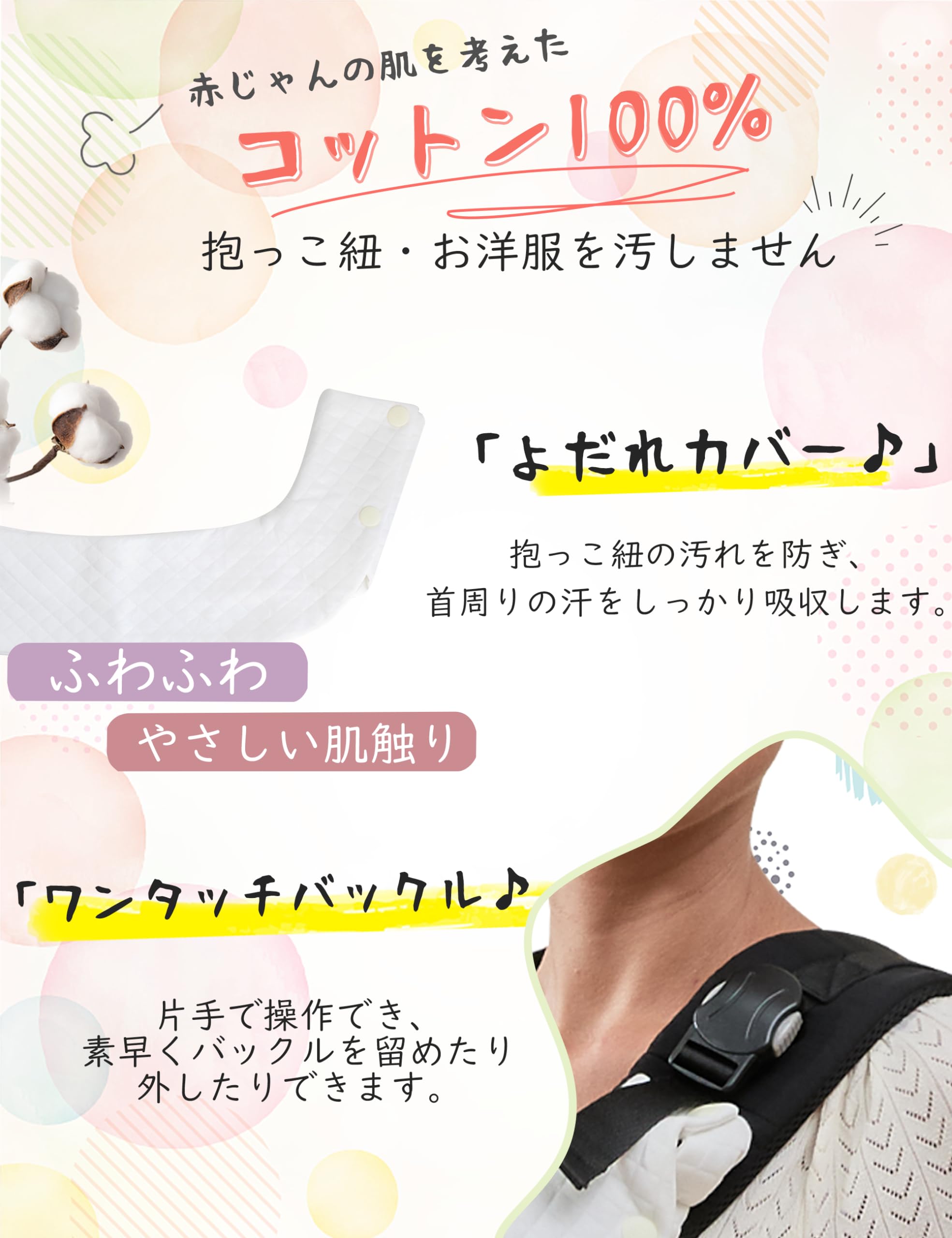 【防水よだれカバー付き】CUBY新生児の抱っこ紐は防水よだれカバーが付きます。防水構造を採用し、たっぷりよだれもしっかりキャッチ! コットン100%ガーゼを贅沢に使用した胸当てカバーです。抱っこ紐・お洋服を汚しません。