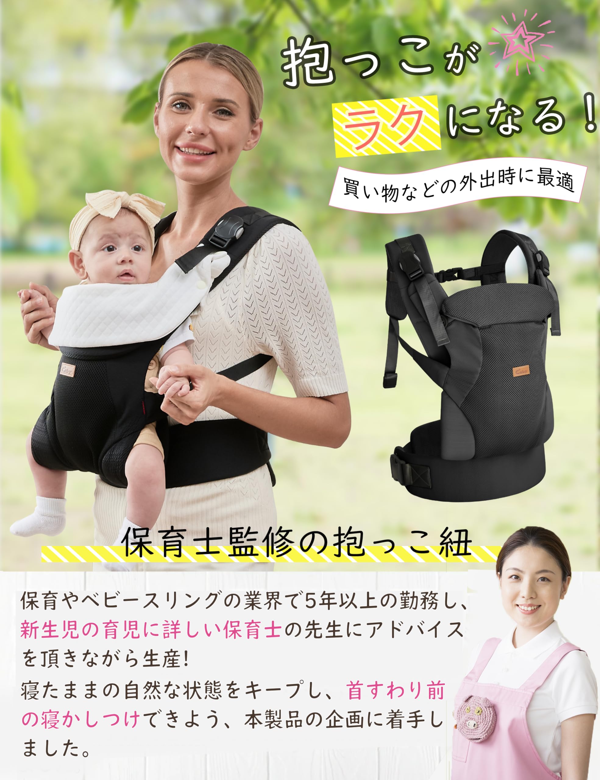 【快適設計】CUBY新生児だっこ紐は腰サポートがあるのでパパママの負担を軽減し、快適感抜群!折り畳み式ヘッドサポートが赤ちゃんの首を保護し、寝ている間に頭を後ろに倒す心配はありません。足の引っかき傷を防ぐ対策も取っております。この抱っこひもは上質な100%綿で作られており、赤ちゃんや親の肌に柔軟にフィットし、快適で通気、洗濯機で洗うこともできます。