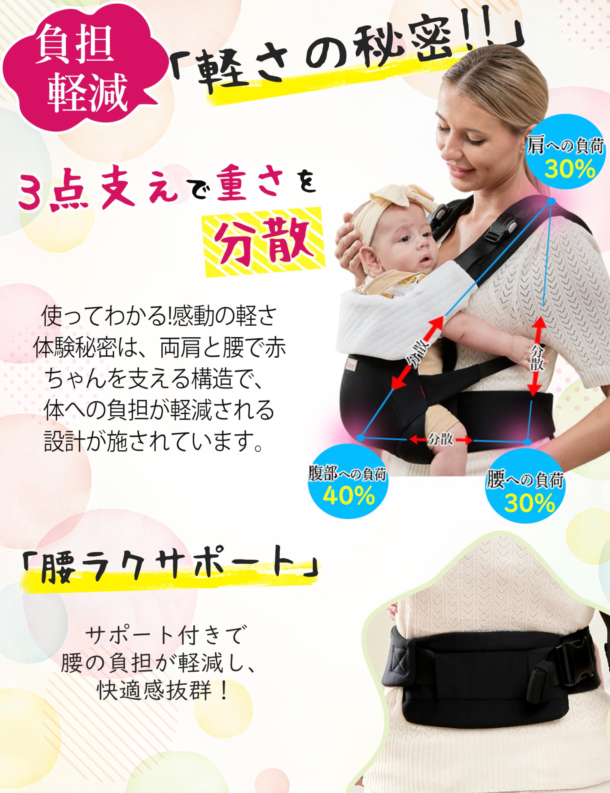 【360°ホールドだっこひも】徹底して素材にこだわり、赤ちゃんが接する内側部分には弾力のあるメッシュ素材を採用し、通気性よく、汗をよく吸収します。また、360°ホールド設計にすることで赤ちゃんが落下する危険を最少に。