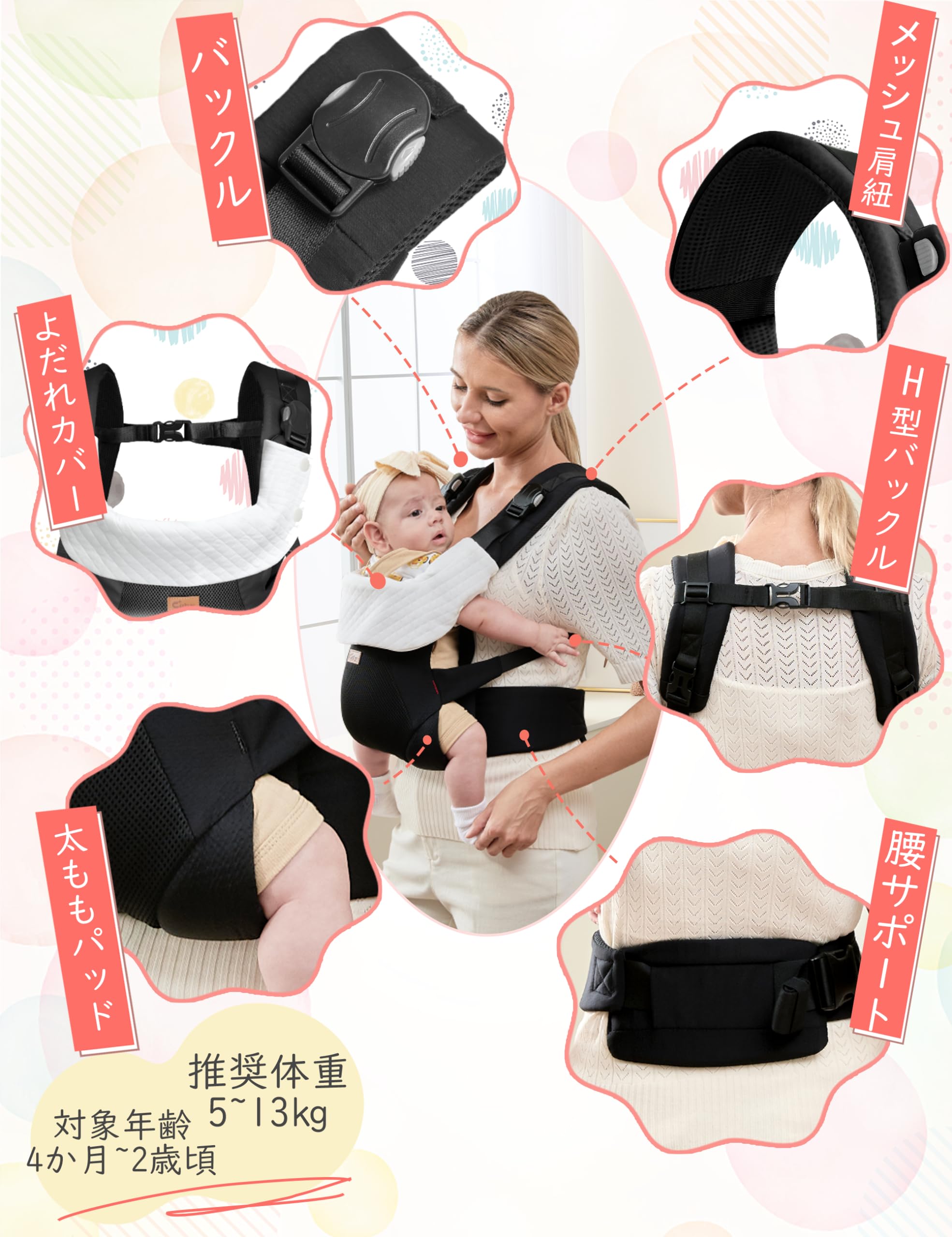 【安心アフターサポート】ご質問等ございましたら専用窓口にてご対応させていただいておりますのでお気軽にお知らせくださいませ。本ベビースリングは90日間の付きでの販売となりますのでご安心してお買い求めください。商品の品質・検品には万全を期しておりますが、万が一製品に不具合や気になる点などございましたら、お気軽にお申しつけくださいませ。スタッフ一同真心を込めてご対応をさせていただきます。【対象年齢】3カ月(腰すわり後)~36カ月まで【推奨】20kgまで。