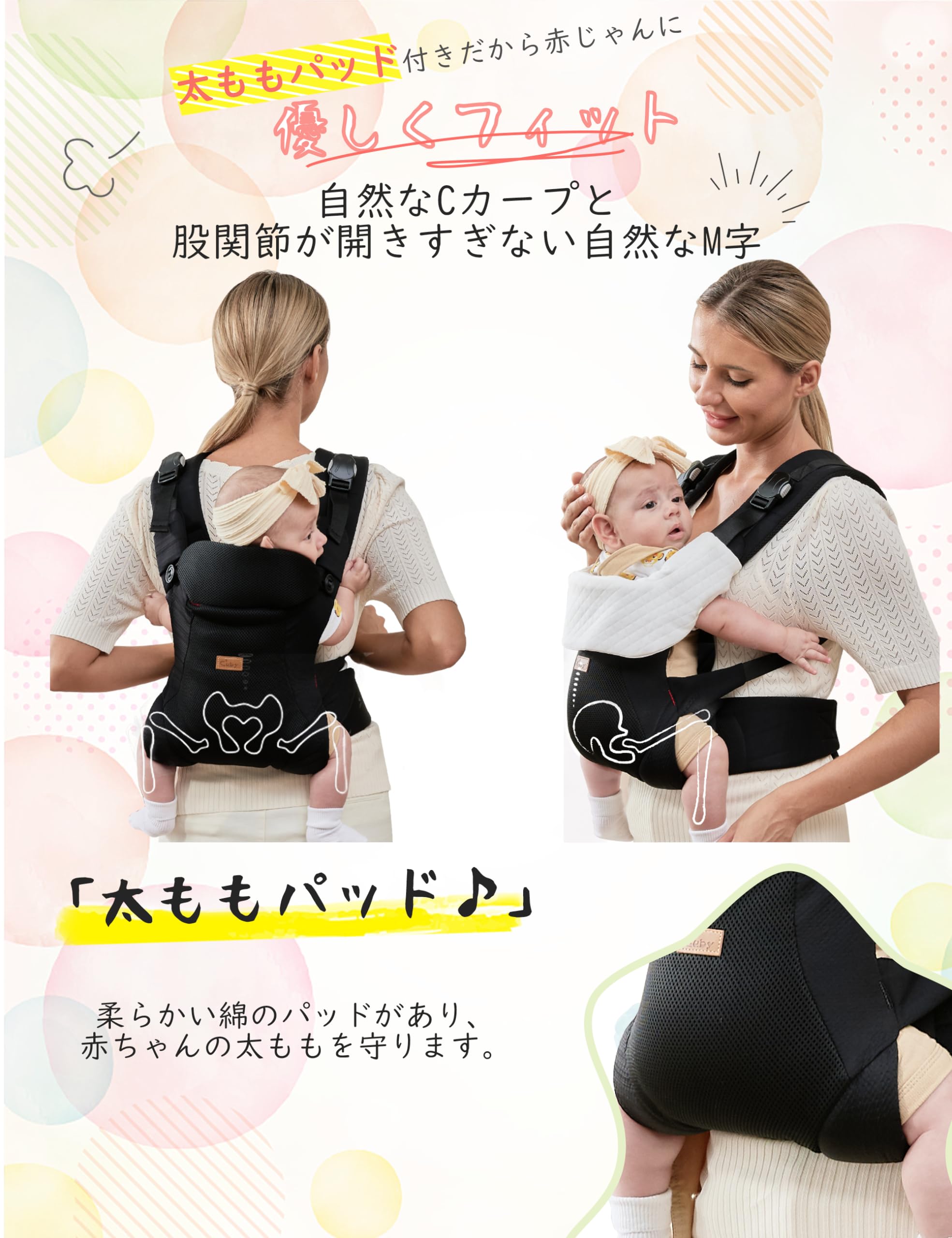 【3WAYの使い道】立体構造だから新生児に優しくフィットします。自然なCカーブと股下を中心に自然なM字体勢でお座りいただけるベビーキャリアです。対面抱っこ、前向き抱っこ、おんぶ紐と状況に合わせてご使用いただけるスリングです。電車やバスなどの移動時や、荷物が増えるお買い物、お散歩はもちろん、イベントや旅行など、さまざまなシーンでお使い頂けます。