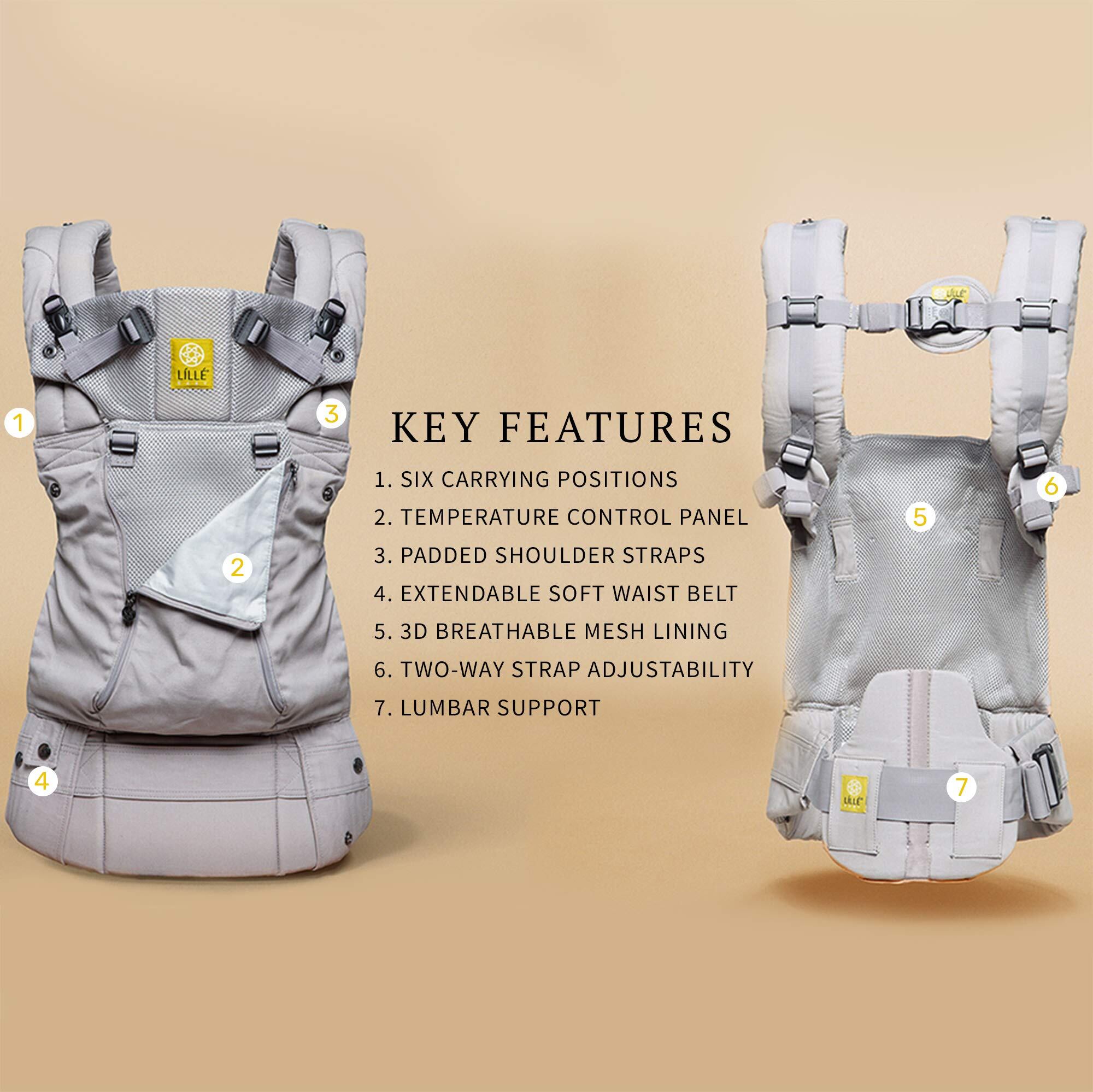 【赤ちゃんをしっかりサポート】独自の腰部サポート、ヘッドレスト、日焼け防止用のフード付き(UPF 50+) ※付属の取扱説明書にはセーフティーハーネスの付属・使用の記載がございますが、本製品含むLILLEbaby製品の現仕様においてセーフティーハーネスなしでも充分に安全であると判断したため、本パッケージには含まれておりません。