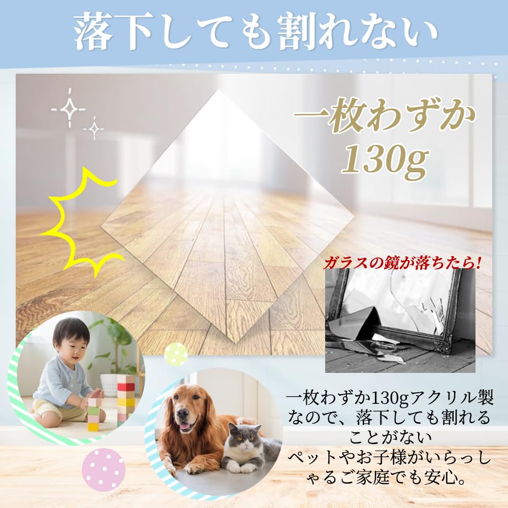 【安全性と耐久性の両立】アクリル製である本製品は、従来のガラスミラーと比べて非常に軽量で割れにくく、万が一の落下時にも飛散することがありません。特に小さな子どもやペットがいる家庭において、怪我のリスクを大幅に軽減するため、安全性に優れています。また、災害時の緊急状況でも安全に使用できるため、家庭内外問わず安心してご利用いただけます。