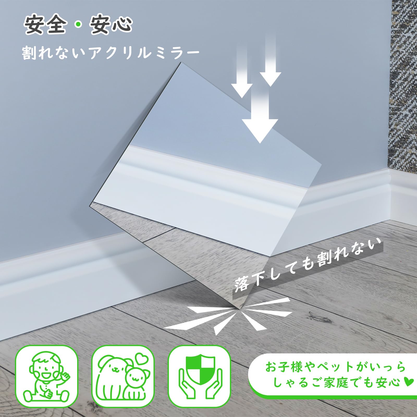 【安全で安心の割れない鏡】超軽量のアクリル材質を採用し、落下しても割れにくく設計。お子様やペットがいるご家庭でも安心して使用でき、貼り付け式でぶつからないように。地震などの災害時にも、鏡の破片が飛び散る心配はありません。