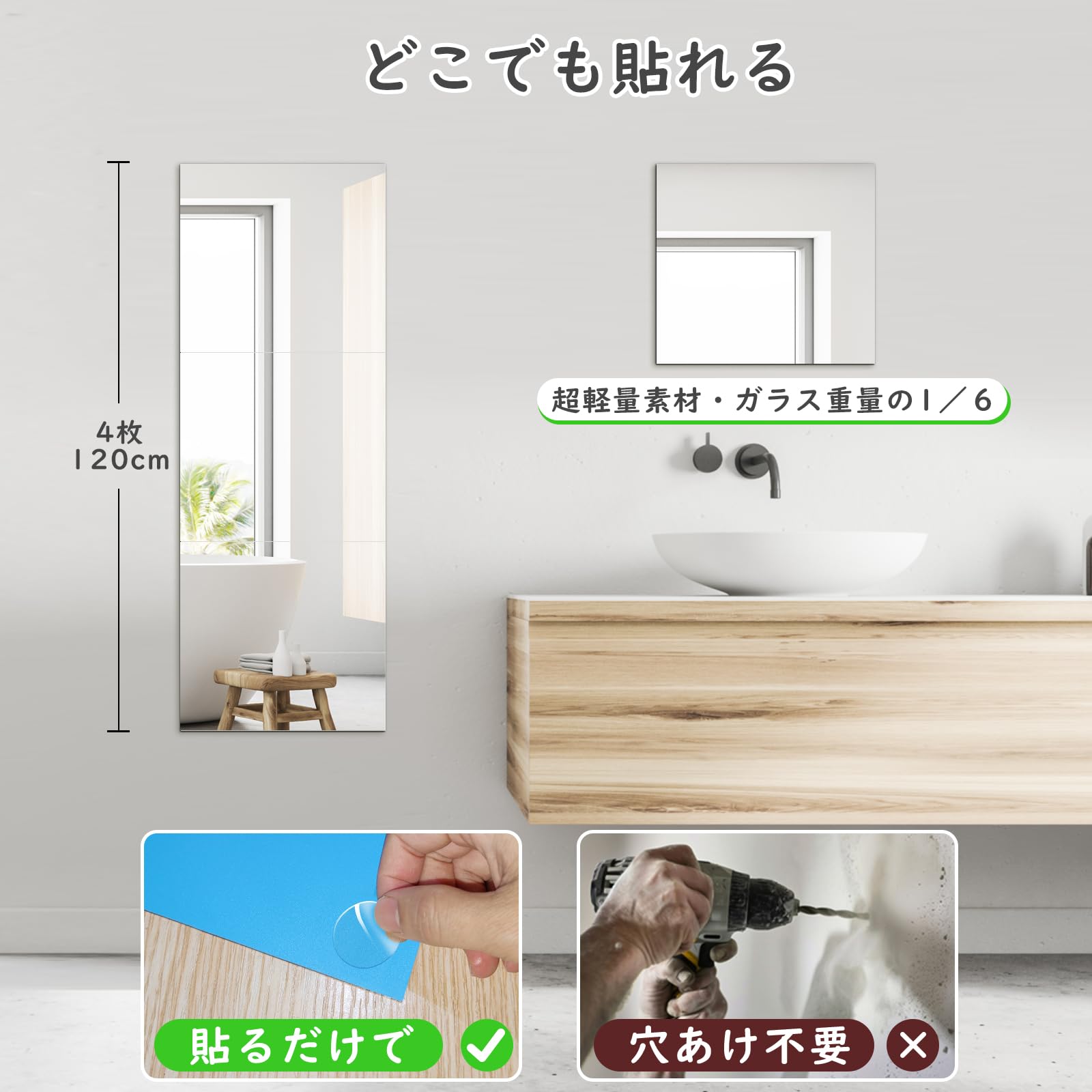 【4枚セットで完璧な全身映し】鏡面を縦に並べると、高さ120×幅28cmの全身鏡を実現します。また、4枚の鏡を自由に組み合わせることで、多様なニーズに対応することができるため、玄関や浴室、更衣室など、あらゆる場所で活躍します。28cm×30cmは正方形ではないので、セット時は設置方向にお気を付けください。