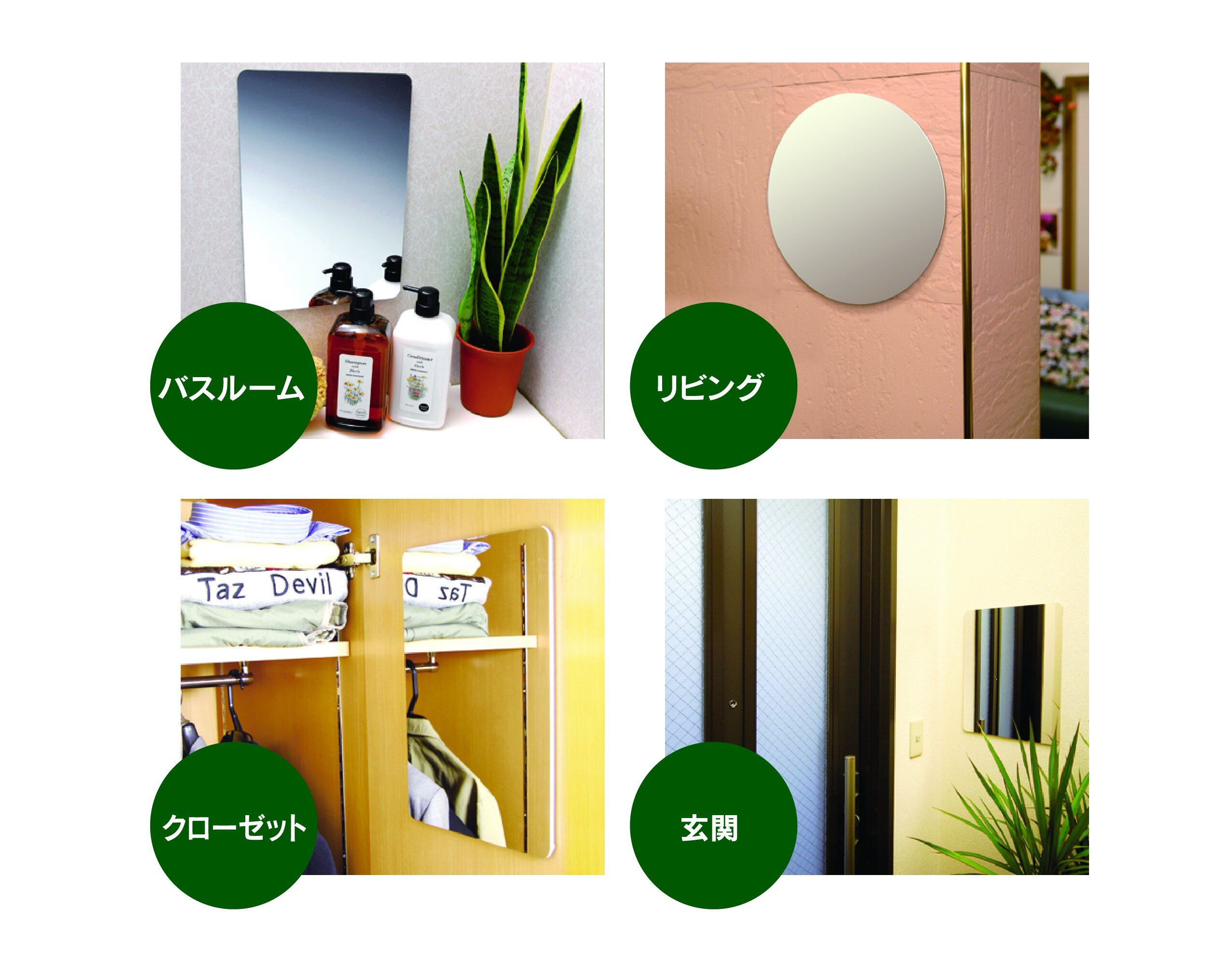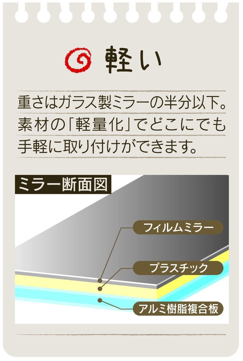 ・軽くて取り付け簡単な樹脂ミラーです。・重さはガラス製鏡の半分以下。・裏面の粘着テープで貼り付けるだけ。どなたでも簡単に取り付けできます。・衝撃に強く、落としてもぶつけても割れません。お子様がいるご家庭でも安心してご使用頂けます。・クローゼット、バスルーム、玄関、リビングなど、手軽に取り付ける事ができます。・ミラー表面にはキズがつきにくいハードコート処理を施しています。 より ●プラスチックとアルミの複合素材で、衝撃に強く割れないミラー●軽さは一般的なガラスミラーの半分以下●粘着テープで簡単取り付け●ミラー表面に、キズつきにくいハードコート加工●アイデア次第で様々な所に使用可能