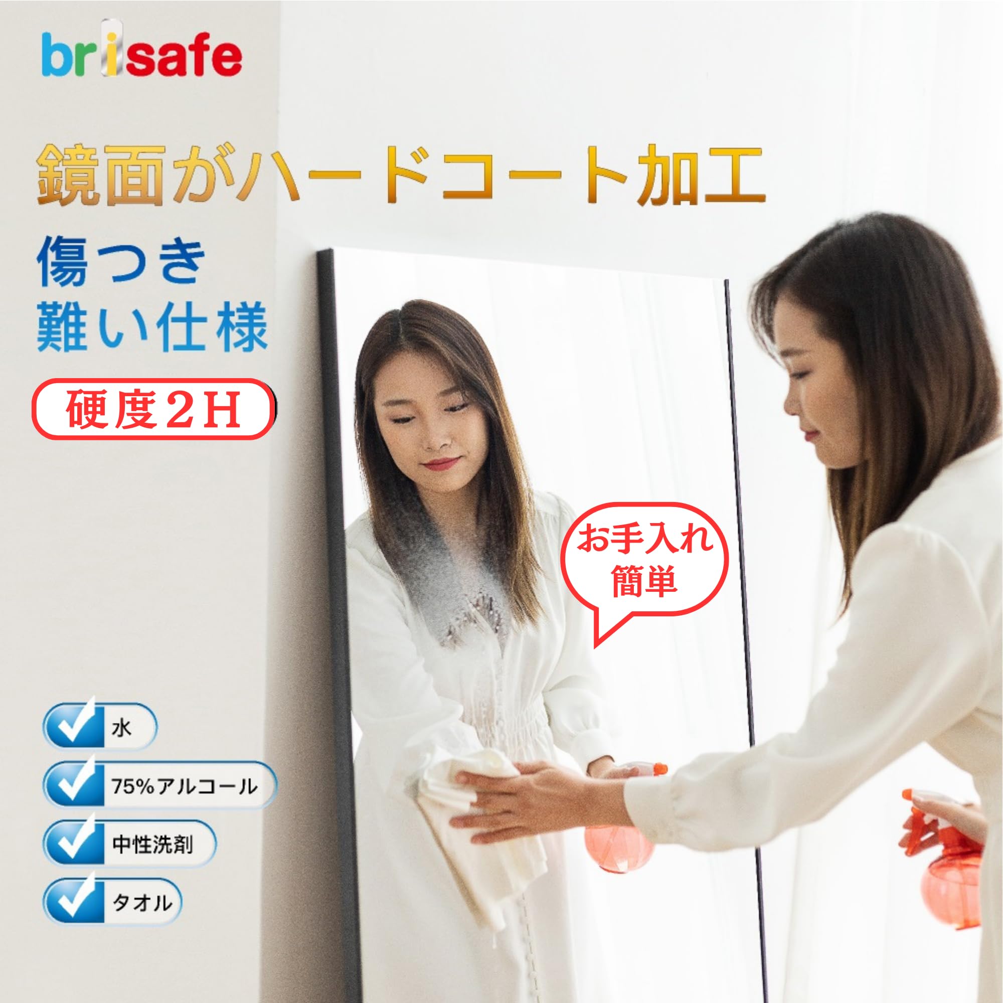 ? 特徴2 【割れない・安全性が高い】ガラスを一切使っていません、安全の鏡面フィルムで加工されたフィルムミラーです。万が一倒れても割れない、怪我をする恐れがありません。 地震対策、保育園や幼稚園の子供さんの居る施設、ダンスやスポーツ競技の場所など、安全を求める場所で防災と安全にお使いいただけます。