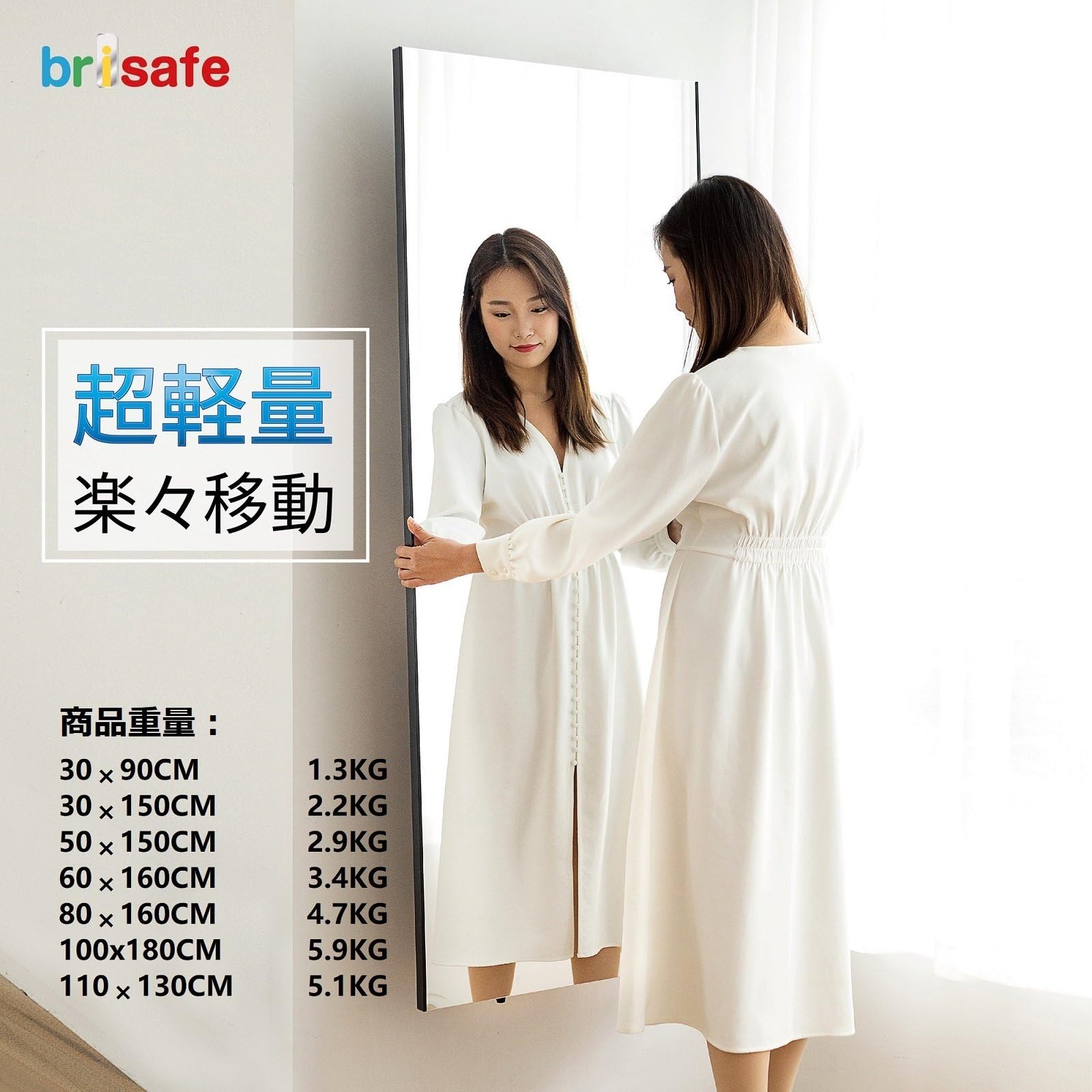 ? 特徴3 【大型でも超軽量を実現】重さがガラス鏡の5分の1しかありません。女性や子供でもラクラクと持てる驚きの軽さ。 商品軽量だから市販品の石膏ボード用フックを使用すれば壁を傷める心配なし、付属のヒモで簡単に壁に吊るすことができます。また部屋から部屋へ移動したり、好きなところに楽に運ぶことができます。家庭用の姿見・全身鏡・ダンスミラー・フィットネスなど様々なシーンでミラーとして使われます。