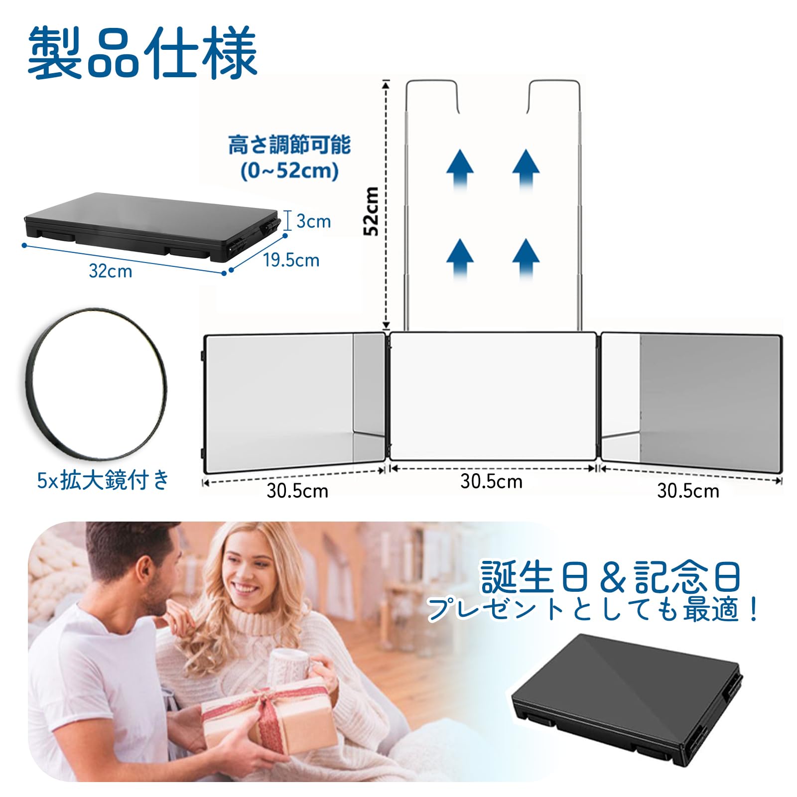 三面鏡 セルフカット 高さ調節可能 360°角度自在調整 三面鏡 後ろが見える 化粧鏡 持ち運び 折り畳み収納 立体三面鏡 広い視野角 壁掛け式 3ウェイミラー セルフカット 安定感 飛散防止 HD鏡面 後頭部が見える 5倍拡大鏡付き (ブラック)