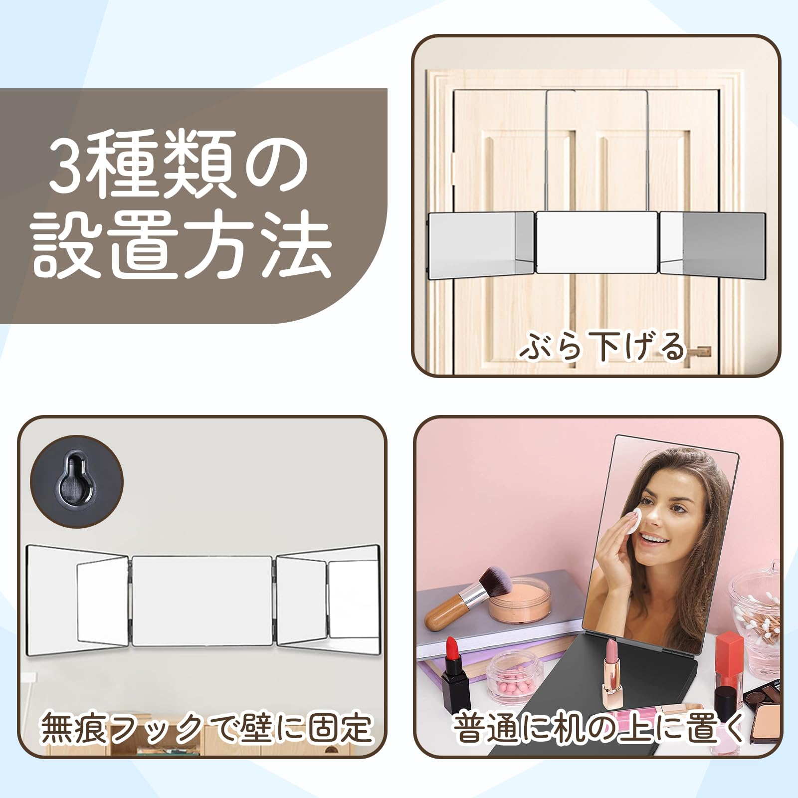 【完璧なメイク】最新セット内容: 三面鏡 x1.5倍の拡大鏡x1 360度回転設計の三面鏡、あらゆる角度から頭と顔などを快適に見ることができ、完璧なメイクを作り上げます、ヘアカット、化粧、髪染め、さげ編み、毛先切りなど、様々な用途があります。卓上での使用もでき、座り状態でメイクやヘアセットを行う場合にも使える万能型です。