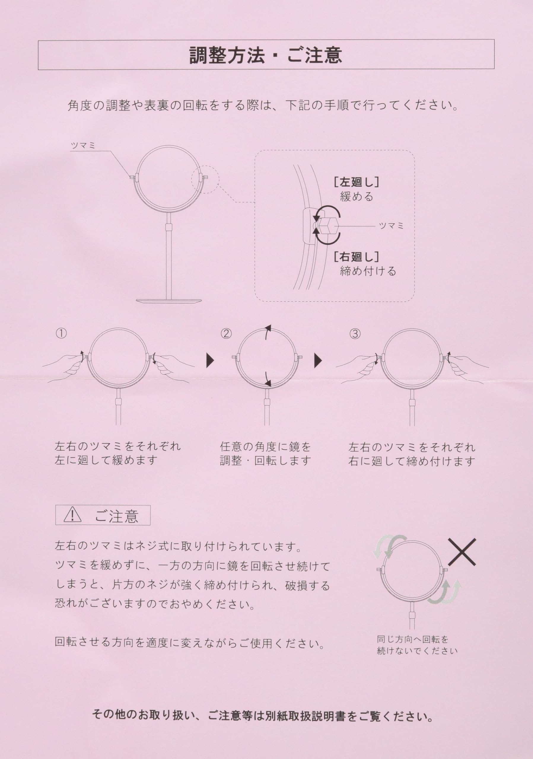 取り扱いに注意してください。鏡が割れると怪我をする恐れがあります。設置の際は確実に固定し、落下や衝撃に注意してください。