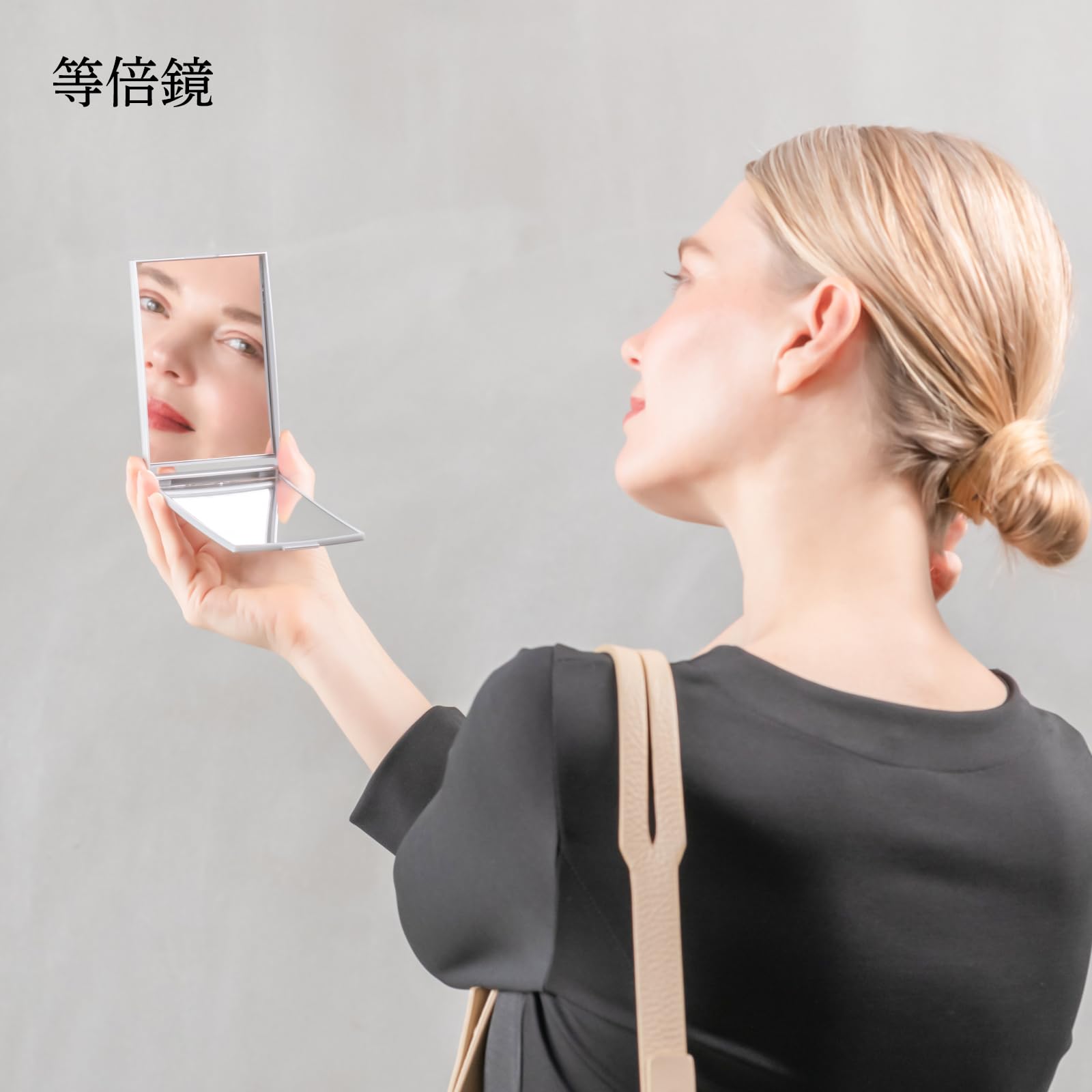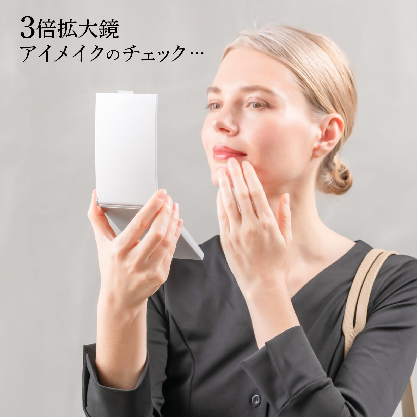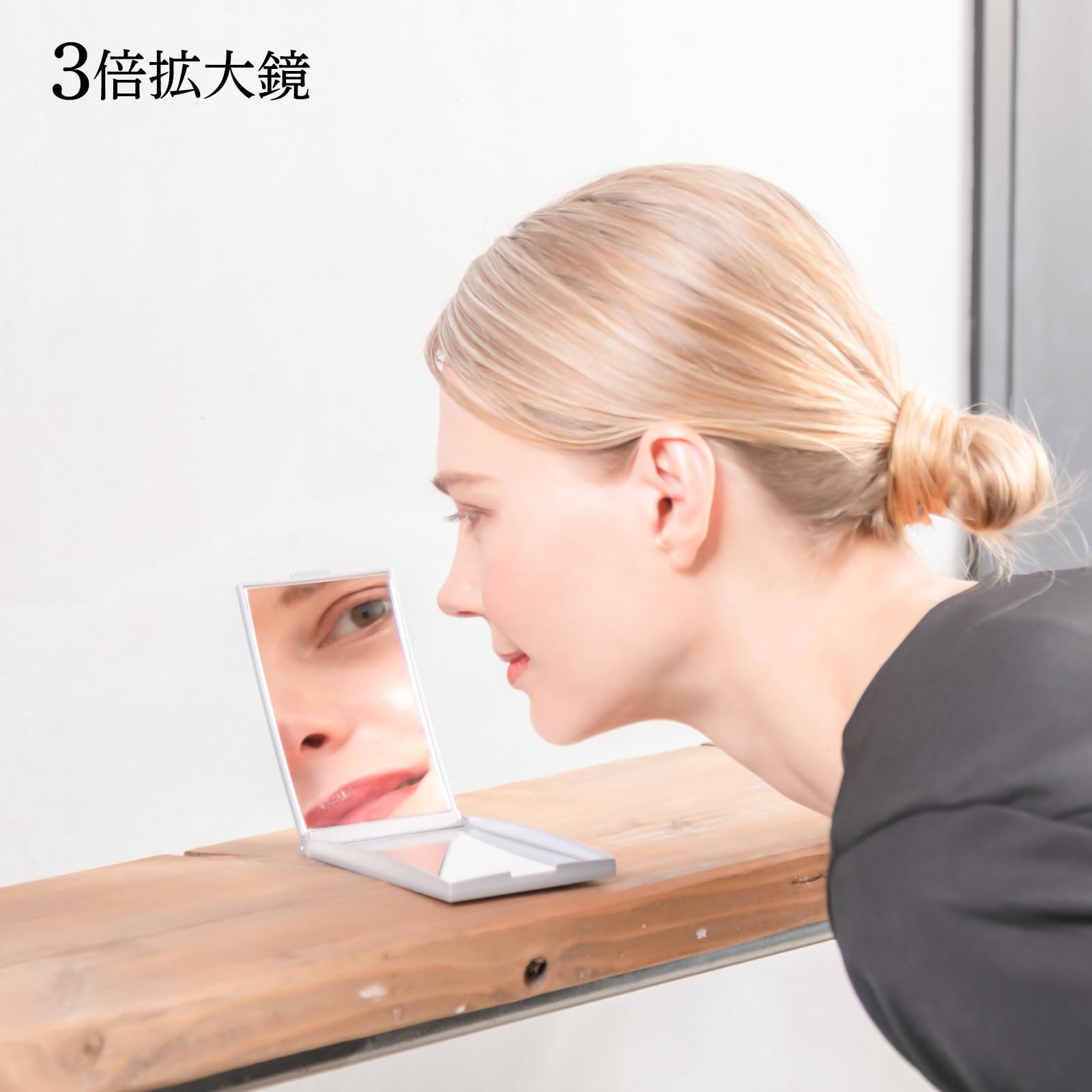 【3倍拡大鏡】等倍鏡と3倍拡大鏡がセットになった両面コンパクトミラーです。3倍拡大鏡は細部まで大きく見えて角栓・シミ・シワなどお肌のお手入れに最適です。また、コンタクトレンズの装着の時にも役立ちます。