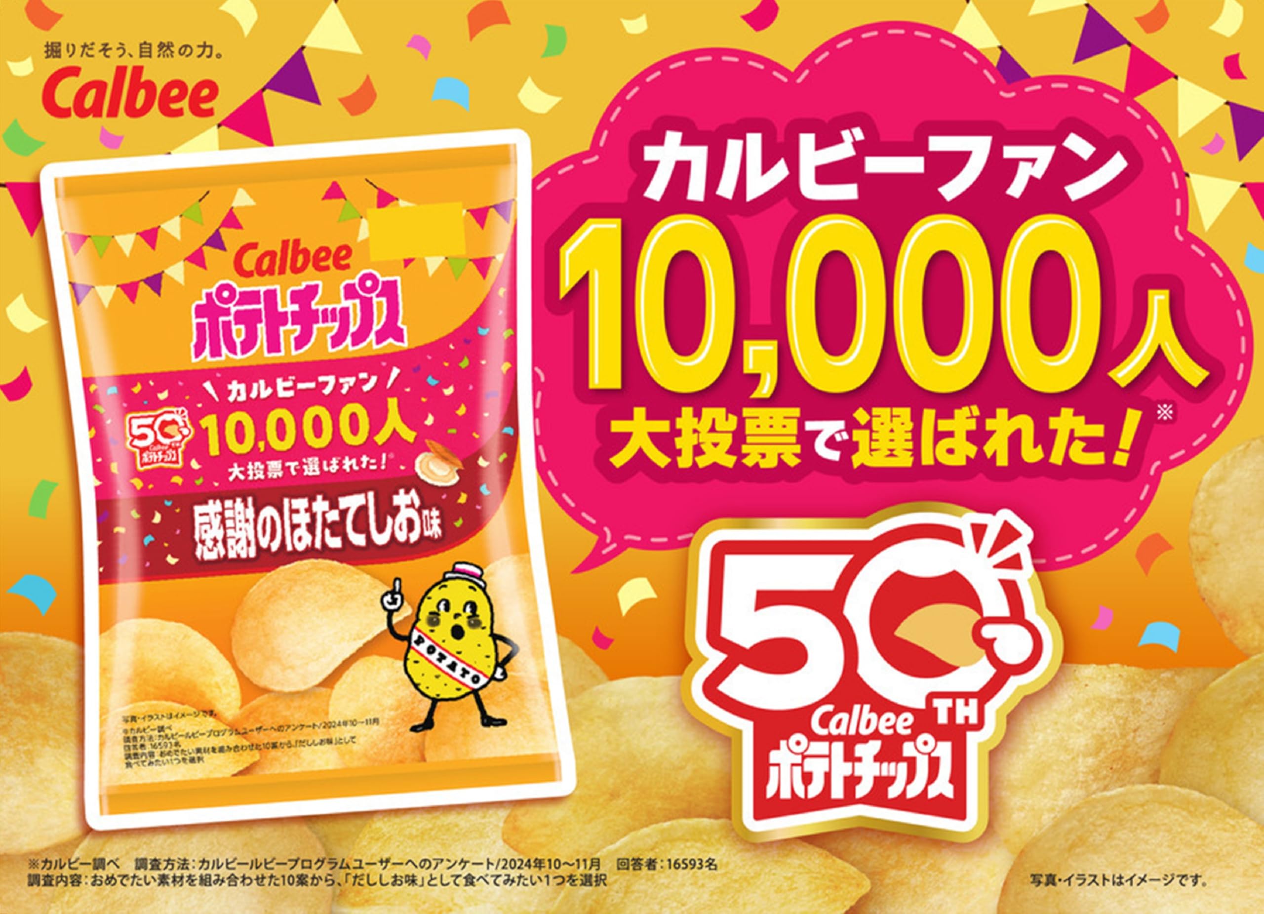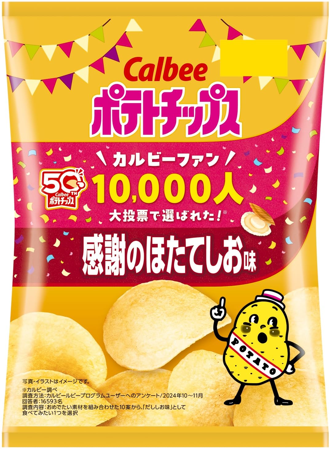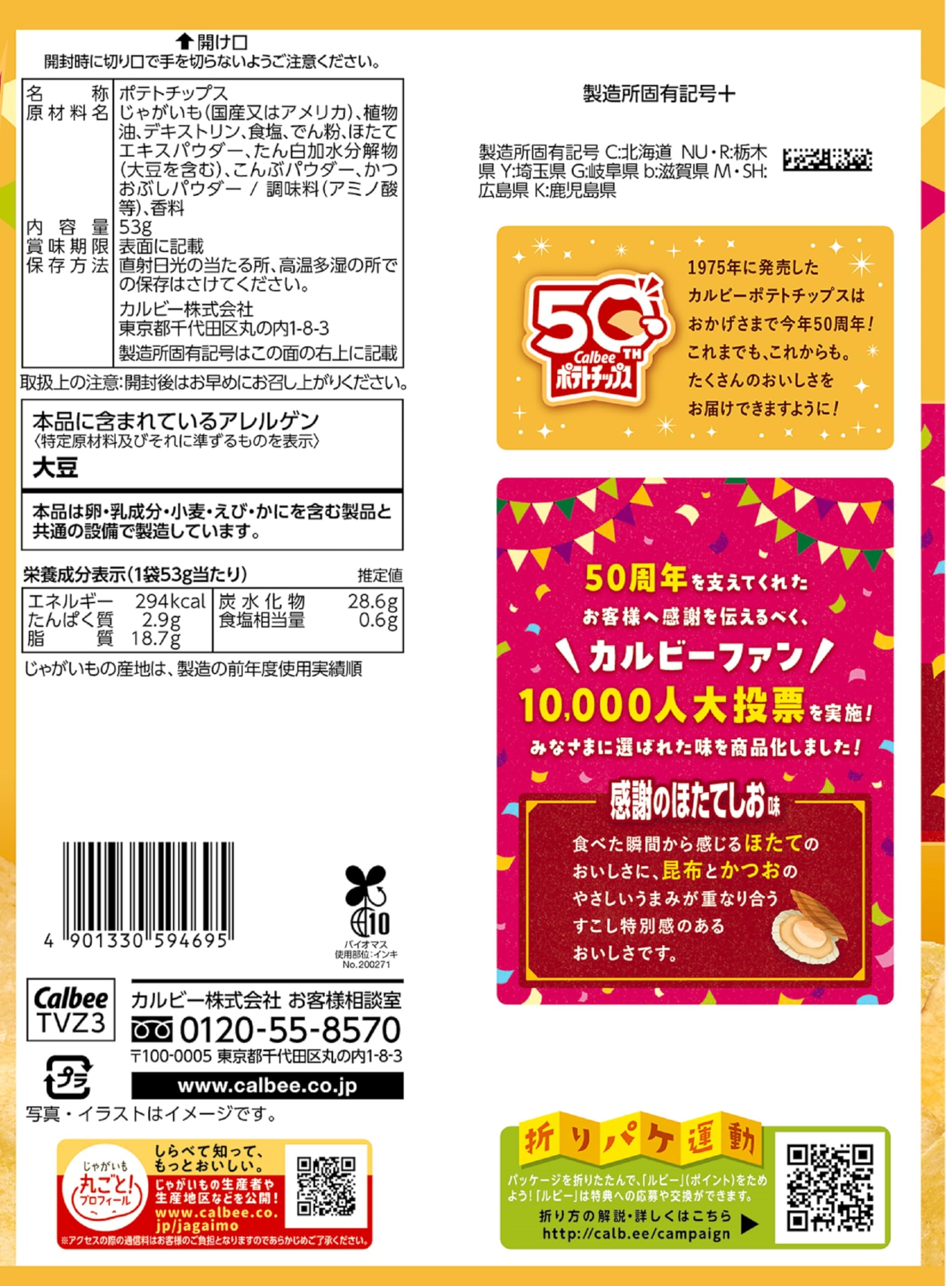 カルビー ポテトチップス感謝のほたてしお味 53g×12袋 食べた瞬間から感じるほたてのおいしさ ルビーファン10,000人の大投票で選ばれた味を商品化!ほたてのおいしさに、昆布とかつおのやさしいうまみが重なり合う特別感のあるおいしさです。 原材料・成分 じゃがいも(国産又はアメリカ)、植物油、デキストリン、食塩、でん粉、ほたてエキスパウダー、たん白加水分解物(大豆を含む)、こんぶパウダー、かつおぶしパウダー / 調味料(アミノ酸等)、香料