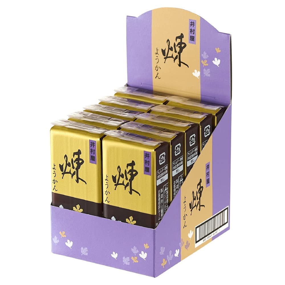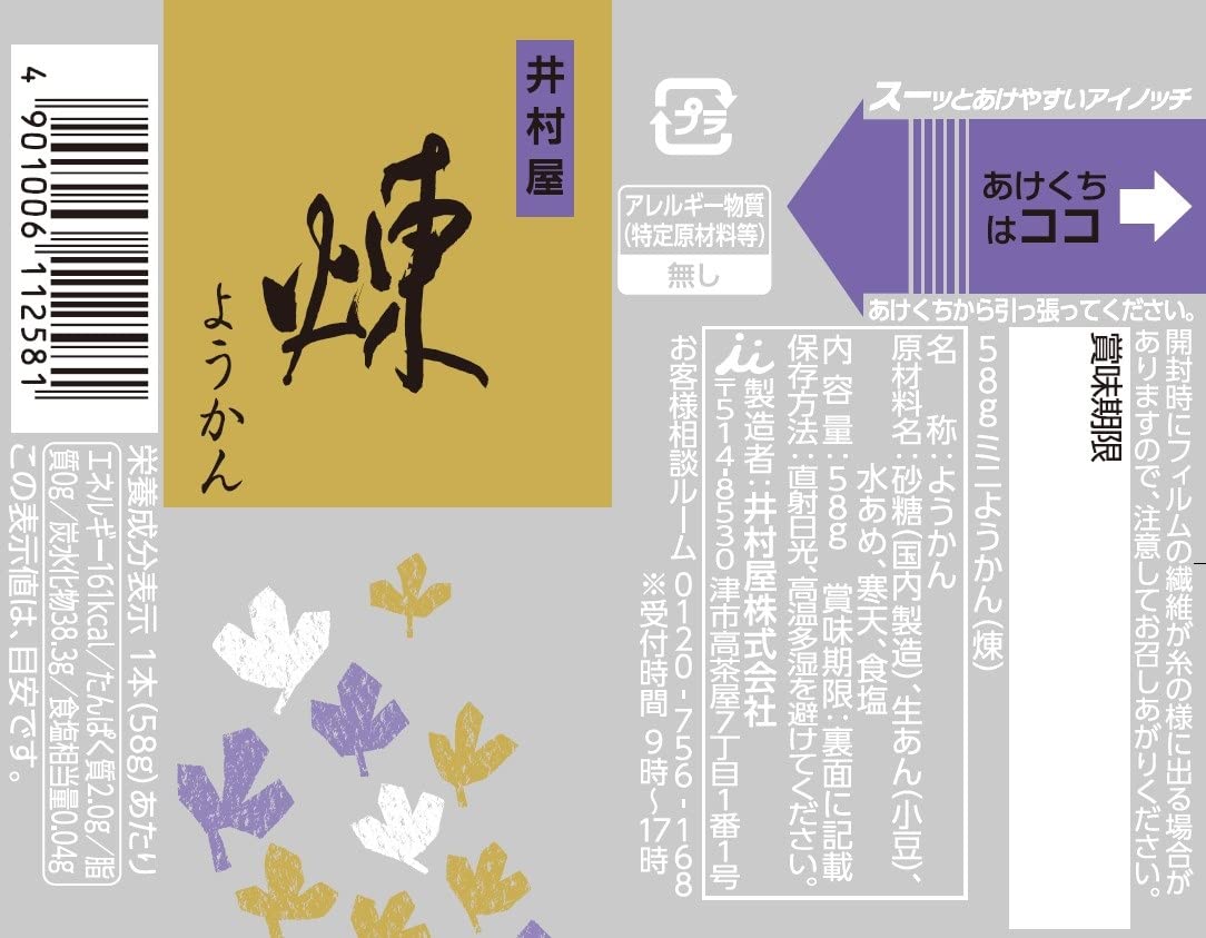 井村屋 58gミニようかん 煉 58g×10個 プラスチック じっくり炊きあげた小豆の風味豊かな煉ようかんです。スーッとあけやすいアイノッチを採用し、開封性を向上させました。小腹がすいたときや、ちょっと甘いものがほしいときに適した食べ切りサイズのミニようかんです。コンパクトに常温保存できるため、リラックスタイムのおやつとして、来客時のお茶請けとしてのストックに便利です。 原材料・成分 砂糖(国内製造)、生あん(小豆)、水あめ、寒天、食塩