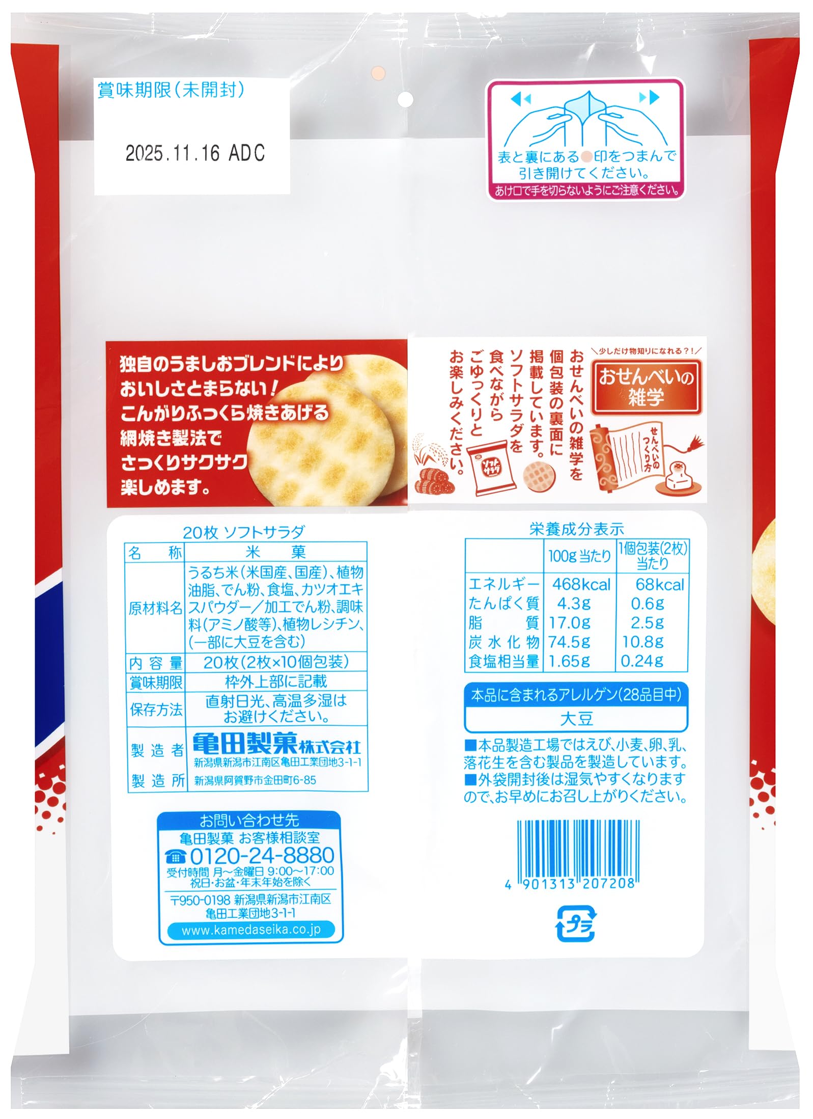 亀田製菓 ソフトサラダ 20枚×12袋 ふわっと焼きあげたソフトな食感のおせんべいです。沖縄の塩シママースで旨味とコクのある塩味に仕上げました。 ふわっと焼きあげたソフトな食感のおせんべいです。沖縄の塩シママースで旨味とコクのある塩味に仕上げました。 原材料・成分 うるち米(米国産、国産)、植物油脂、でん粉、食塩、カツオエキスパウダー/加工でん粉、調味料(アミノ酸等)、植物レシチン、(一部に大豆を含む)