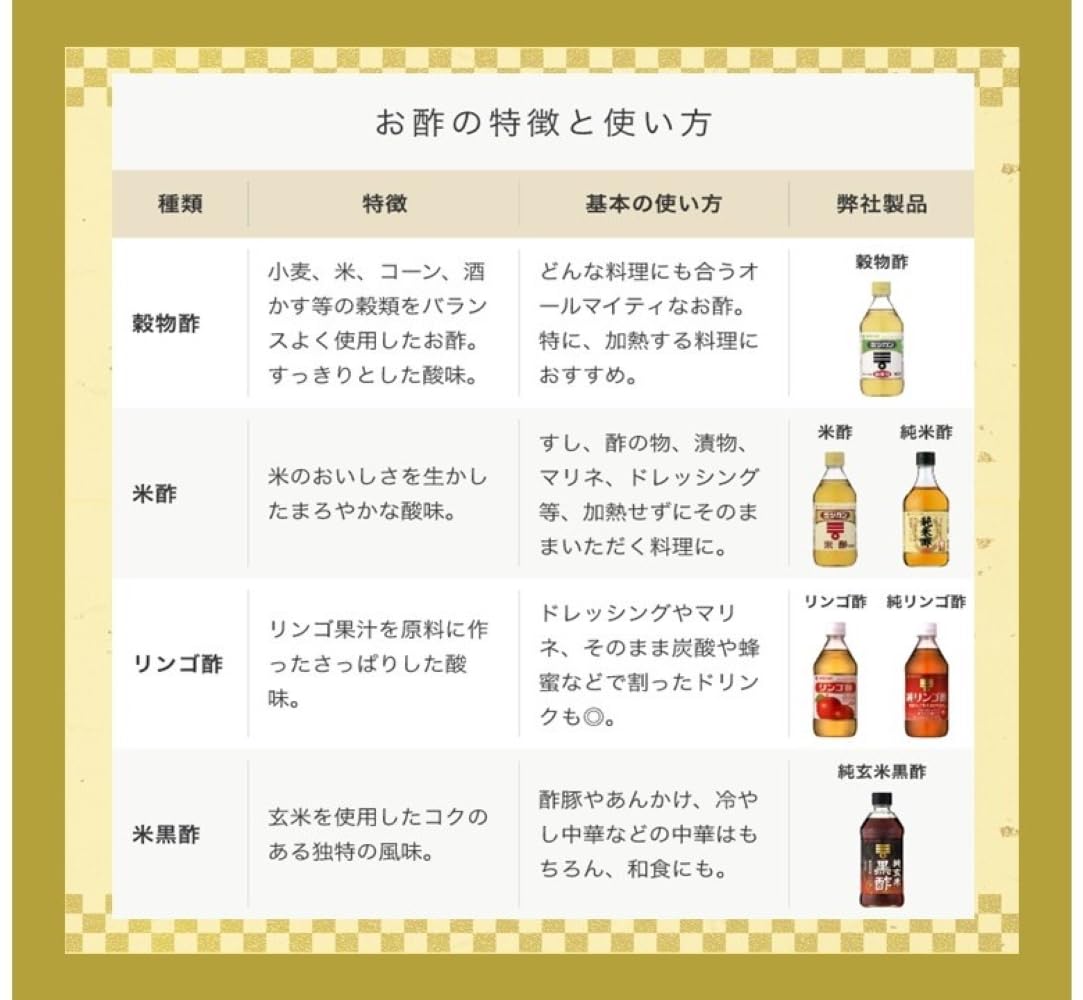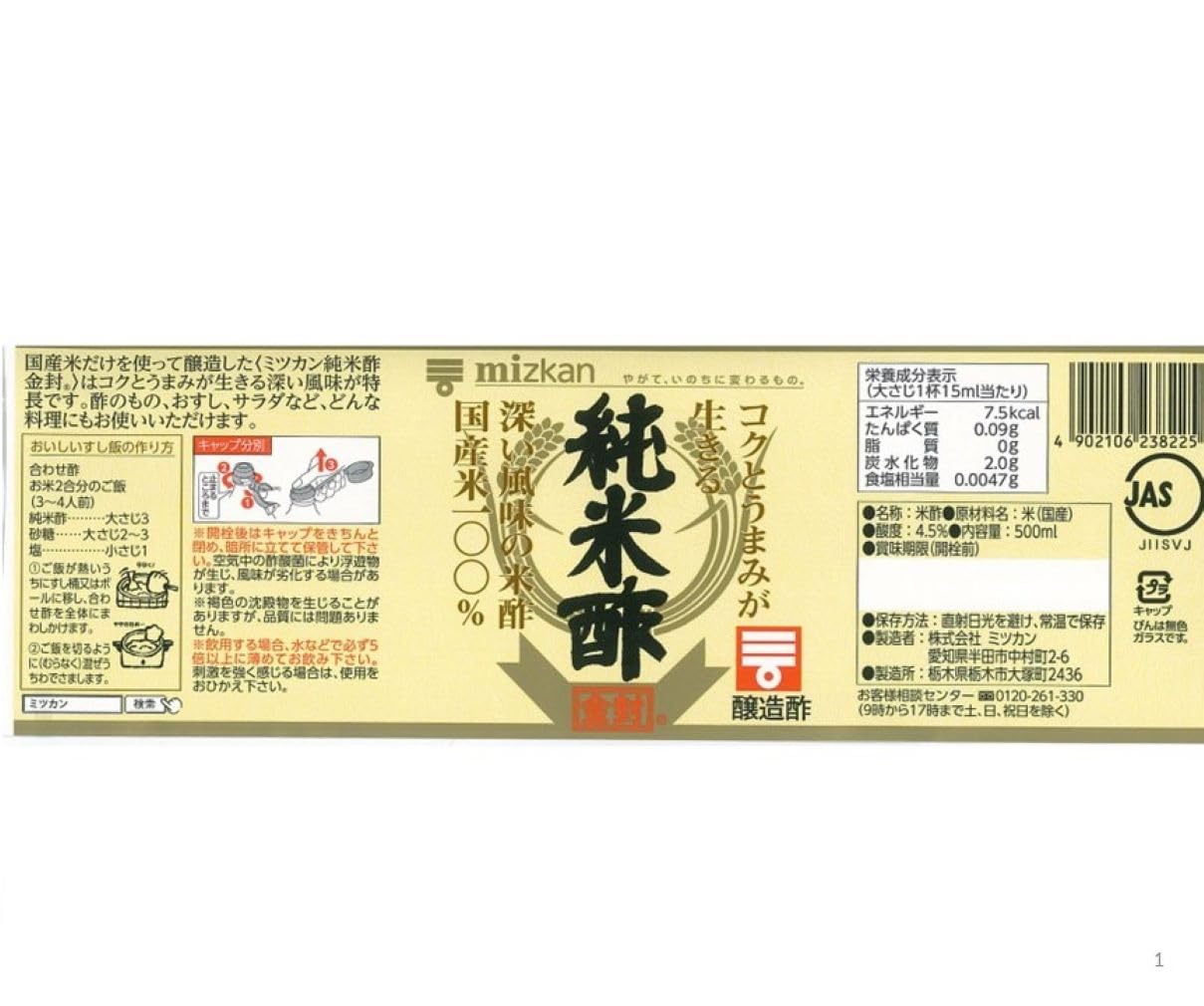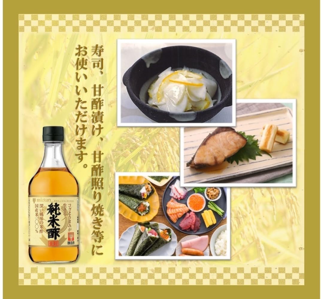 国産米だけを使って醸造した<ミツカン純米酢 金封>は、コクとうまみが生きる深い風味が特長です。酢の物、しめさば、お寿司などの和食に、よく合います。お祝いや行事の時の特別なお料理にもお使いください。おいしいすし飯の作り方合わせ酢、お米3合(180mlカップ3杯・4人前)、純米酢大さじ4、砂糖大さじ4-5、塩小さじ2●お米は、炊く30-40分前に洗い、やや固めに炊き上げます。●ご飯が熱いうちにすし桶又はボールに移し合わせ酢を全体にまわしかけます。●ご飯を切るように(むらなく)混ぜうちわでさまします。*そのままお飲みいただくと、胃やのどがあれることがありますので、水などで、必ず5倍以上に薄めてお飲みください。刺激を強く感じる場合は、使用をおひかえください。