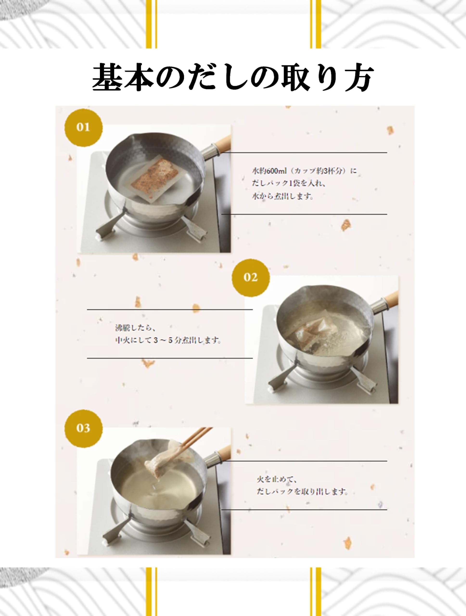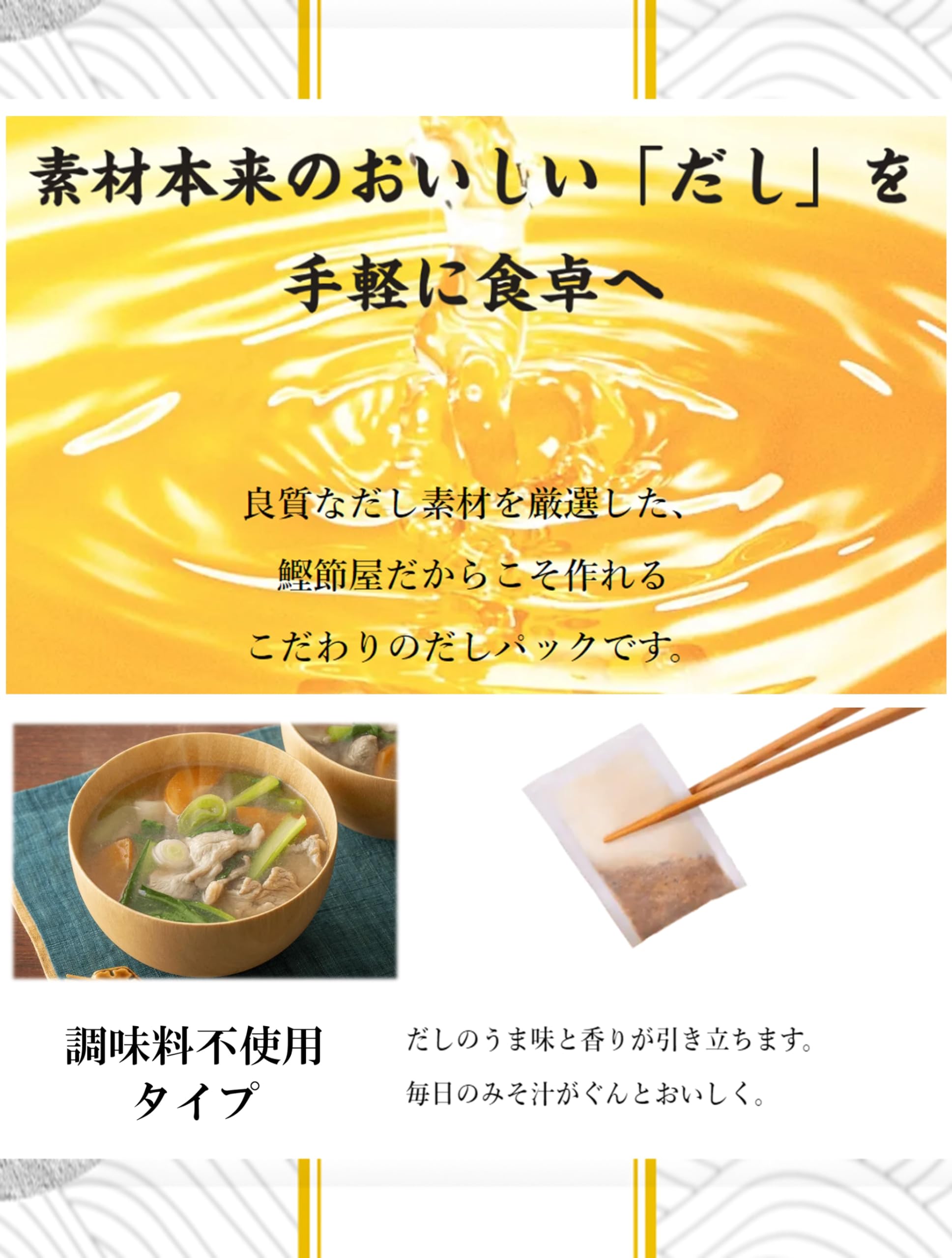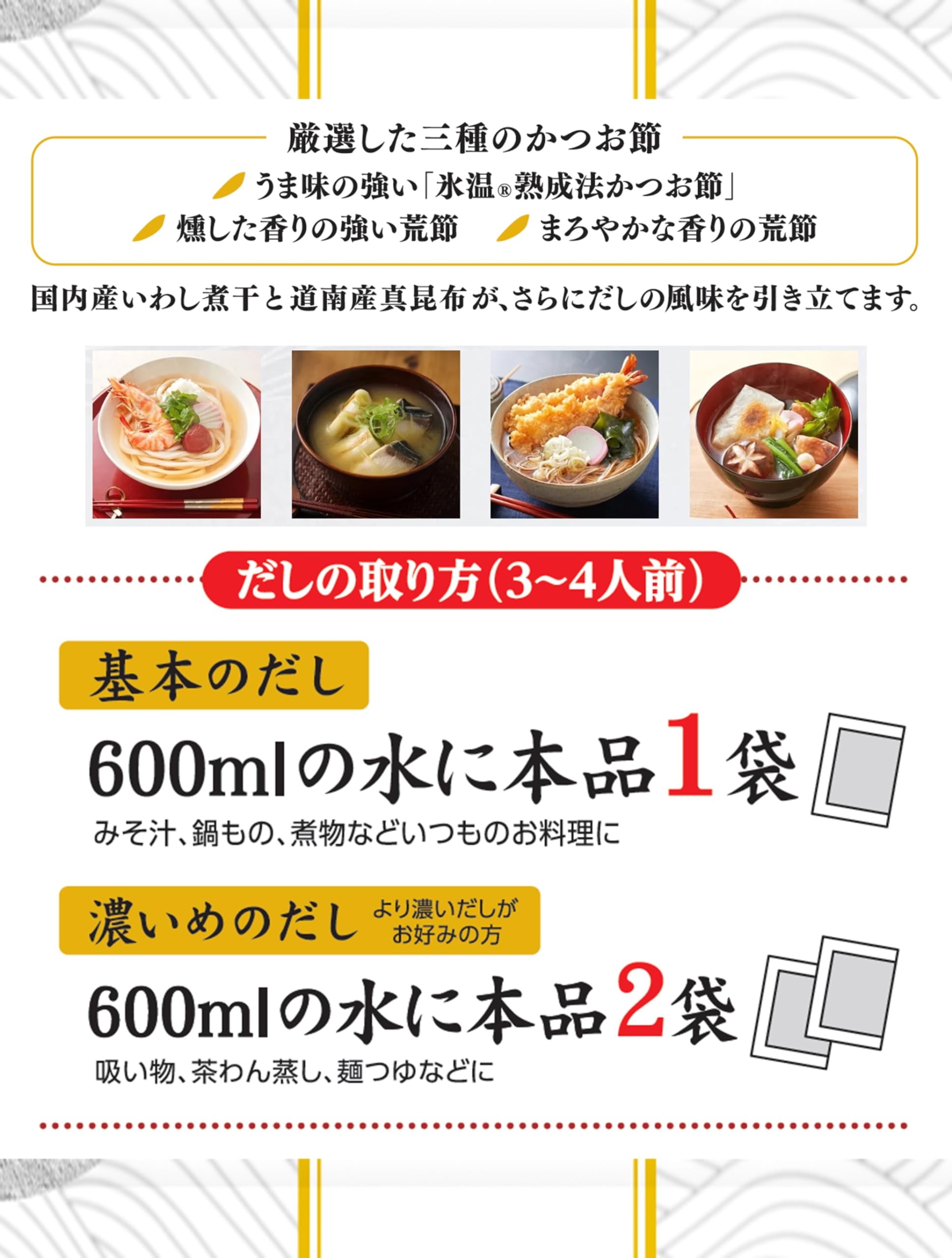 原材料:かつおぶし(国内製造)、いわし煮干、こんぶ