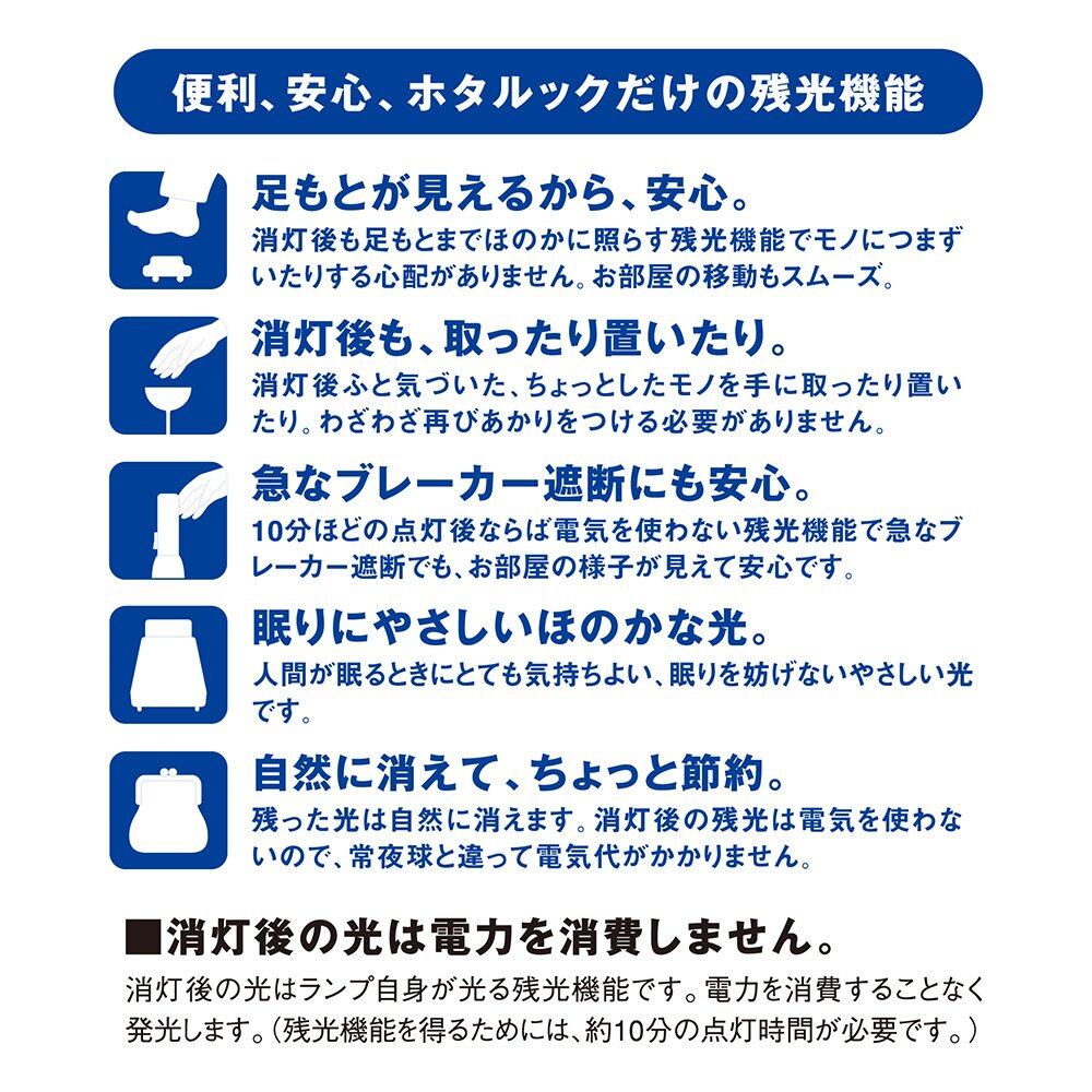 残光:消しても安心、ほのかに見えるスイッチを切った後でも暫くの間、淡いブルーグリーンのほのかな明かりが残るので、お子様にも安心して眠っていただけます。また突然の停電時にもお部屋がすぐに真っ暗になることもなく、「安心・安全・便利な機能」です。