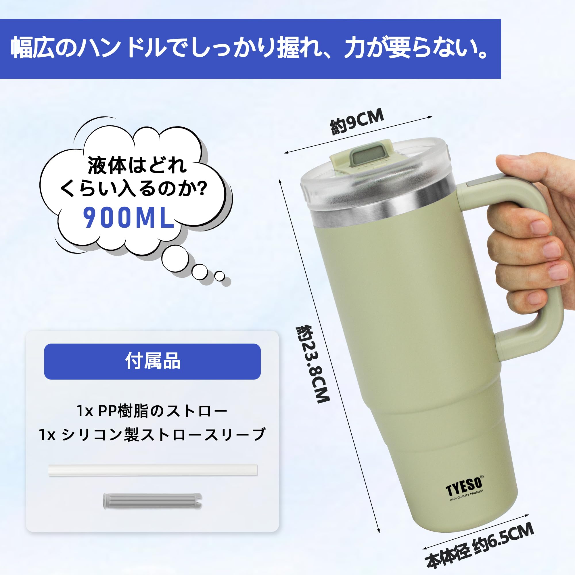 【人気】TYESO タンブラー 0.9L 水筒 保冷 ステンレスボトル ウォーターボトル ストロー 取っ手付き ジョッキ アウトドア 真空断熱 二重構造 広口 大容量 直飲 女の子 男の子 900ml カーキ