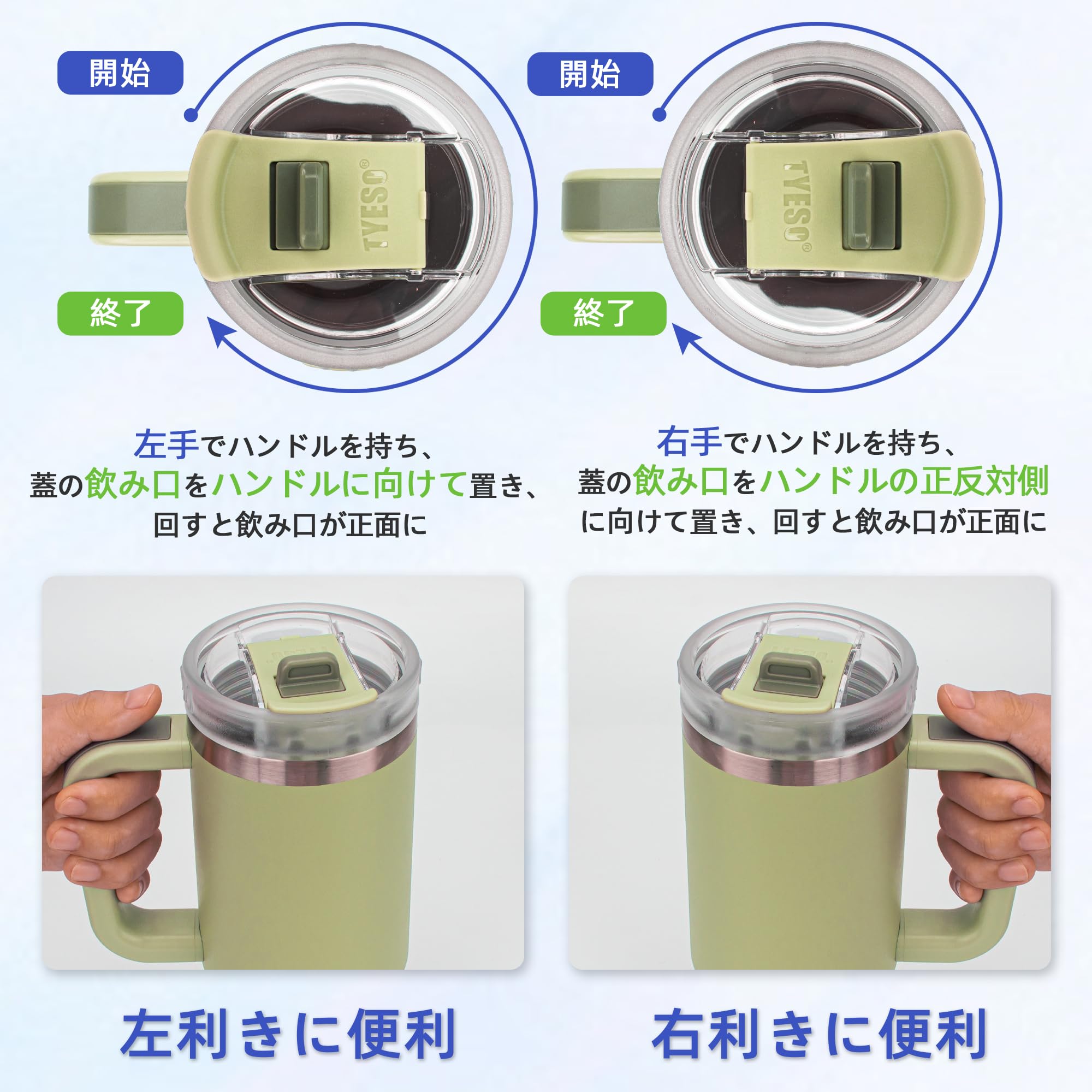 TYESO タンブラー 0.9L 水筒 保冷 ステンレスボトル ウォーターボトル ストロー 取っ手付き ジョッキ アウトドア 真空断熱 二重構造 広口 大容量 直飲 女の子 男の子 900ml カーキ