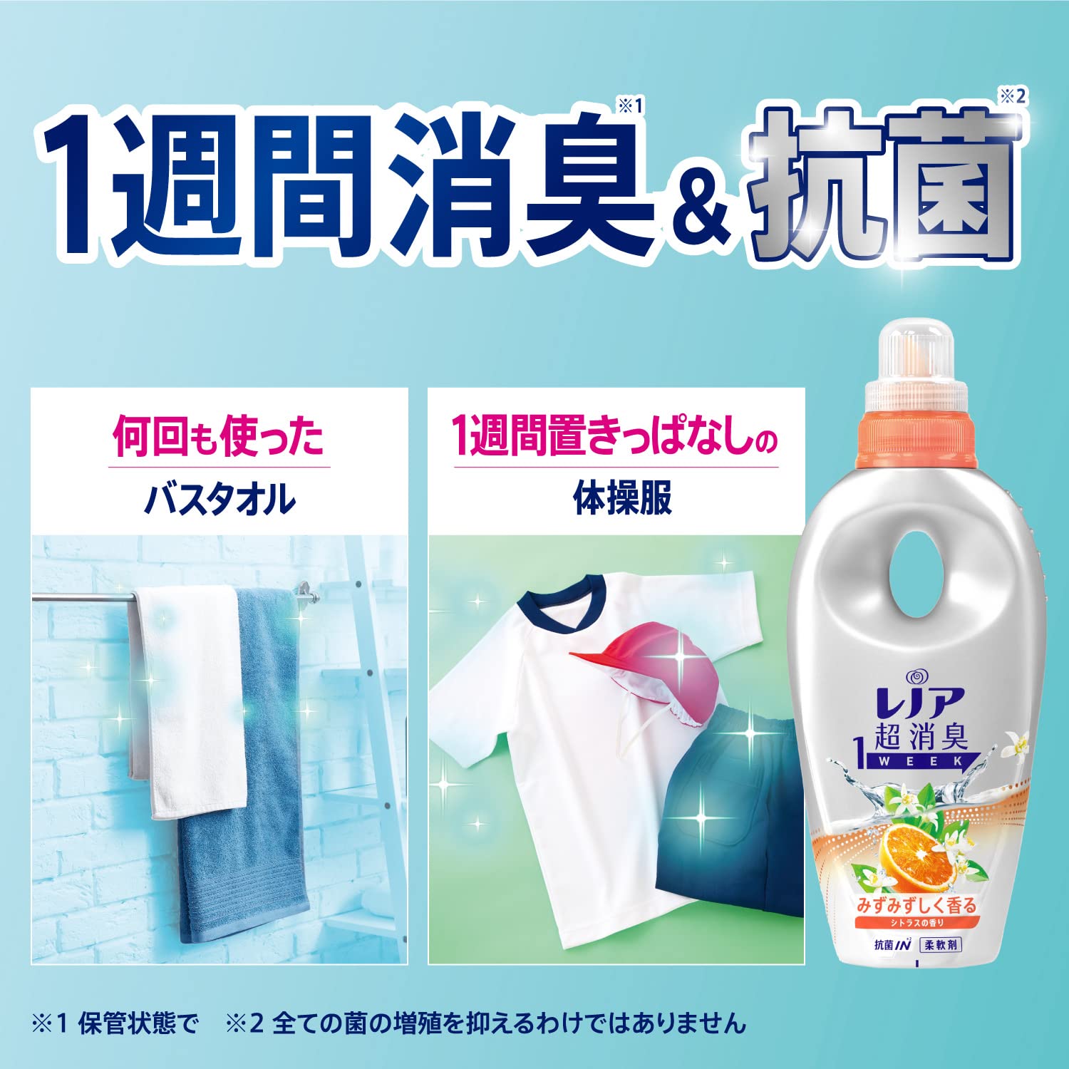 1週間消臭* 1 +抗菌* 2 *1 保管状態で *2 すべての菌の増殖を抑えるわけではありません