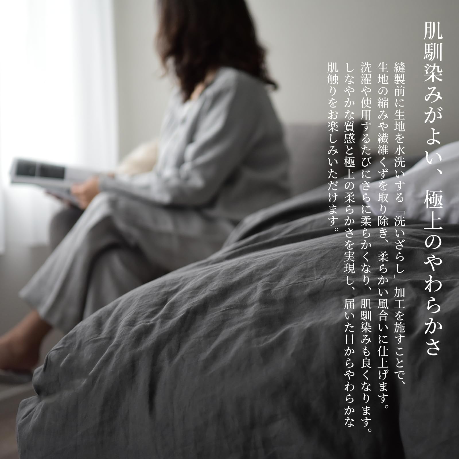 【肌馴染みのよい極上品質:届いた日から実感できる「洗いざらし」加工】 「Lina Blend」布団カバーは、「洗いざらし」加工を施しています。この加工は、あらかじめ生地を洗って、生地の縮みや余分な繊維くずを取り除き、柔らかい風合いに仕上げています。そのため、お届けした瞬間から、まるでずっと使い慣れたお気に入りの一枚のように、ふわりと包み込まれるような極上の肌触りを実感していただけます。新品なのにこの馴染みの良さ。これこそが、お客様の快適さを一番に考えた、スリープテイラーのこだわりです。