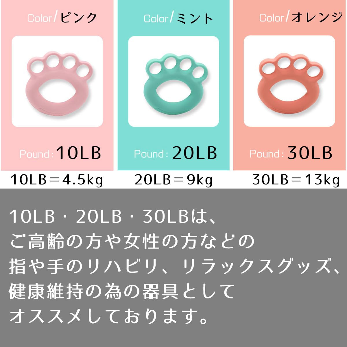 ?【強度6段階バリエーション】 ピンク(10LB=4.5kg) ミント(20LB=9㎏) オレンジ(30LB=13㎏) グリーン(40LB=18㎏) パープル(50LB=23㎏) ブルー(60LB=27㎏) ※LBとはポンド表記になります。 ピンク・ミント・オレンジは高齢者の方や女性の方の指や手のリハビリ、リラックスグッズ、健康グッズとしてオススメです。 グリーン・パープル・ブルーは成人した男女やアスリートの方などの握力アップ、腕の筋力強化を目的とした運動の際のパフォーマンスUPの為の器具として最適です。