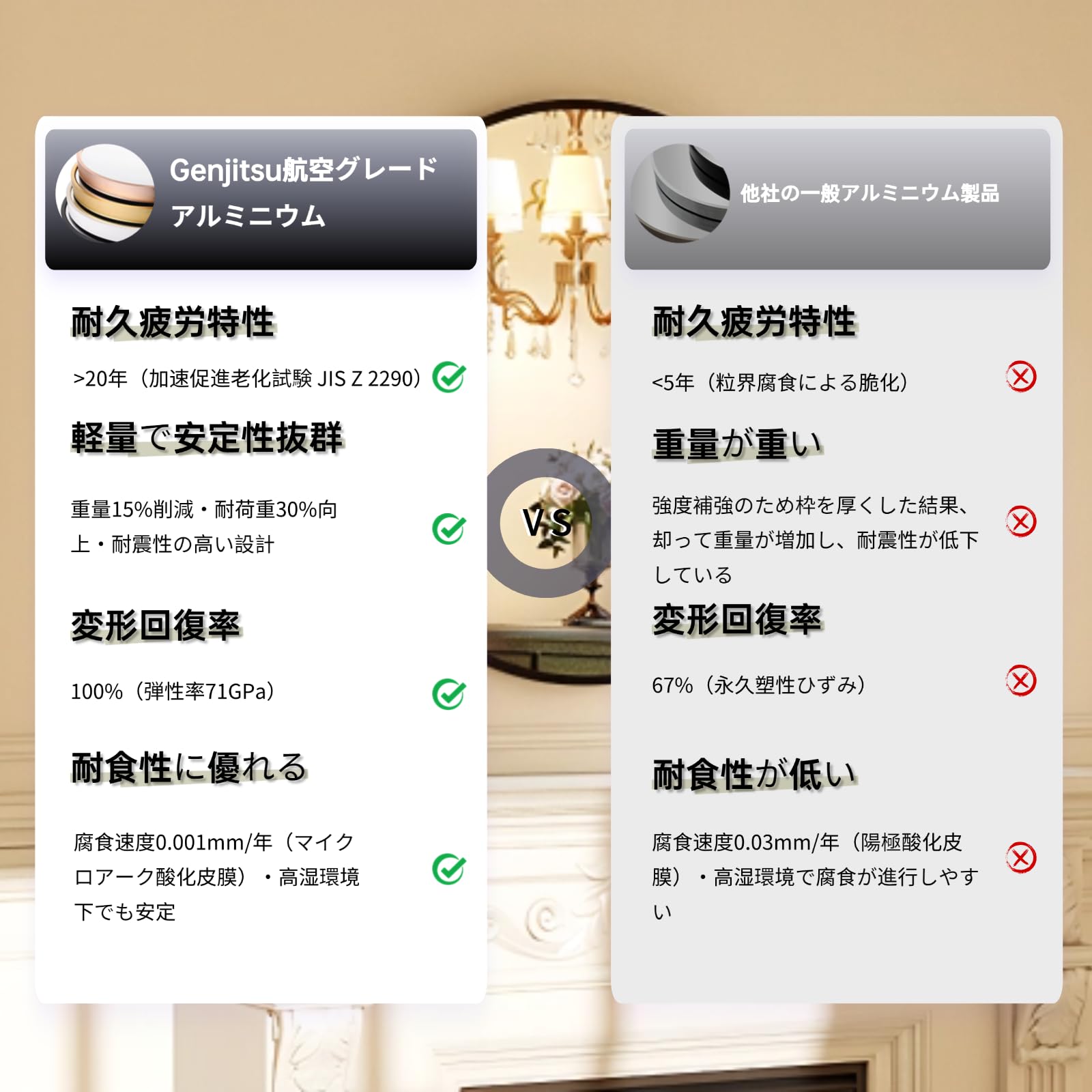 ?【耐久性に優れたアルミ合金フレーム】本体フレームは高品質なアルミ合金製。サビや腐食に強く、磨き消し加工でおしゃれな雰囲気を演出。背面は頑丈なMDFボードで補強され、防水・防湿性に優れ、長く美しい状態を保つ化粧鏡としても最適です