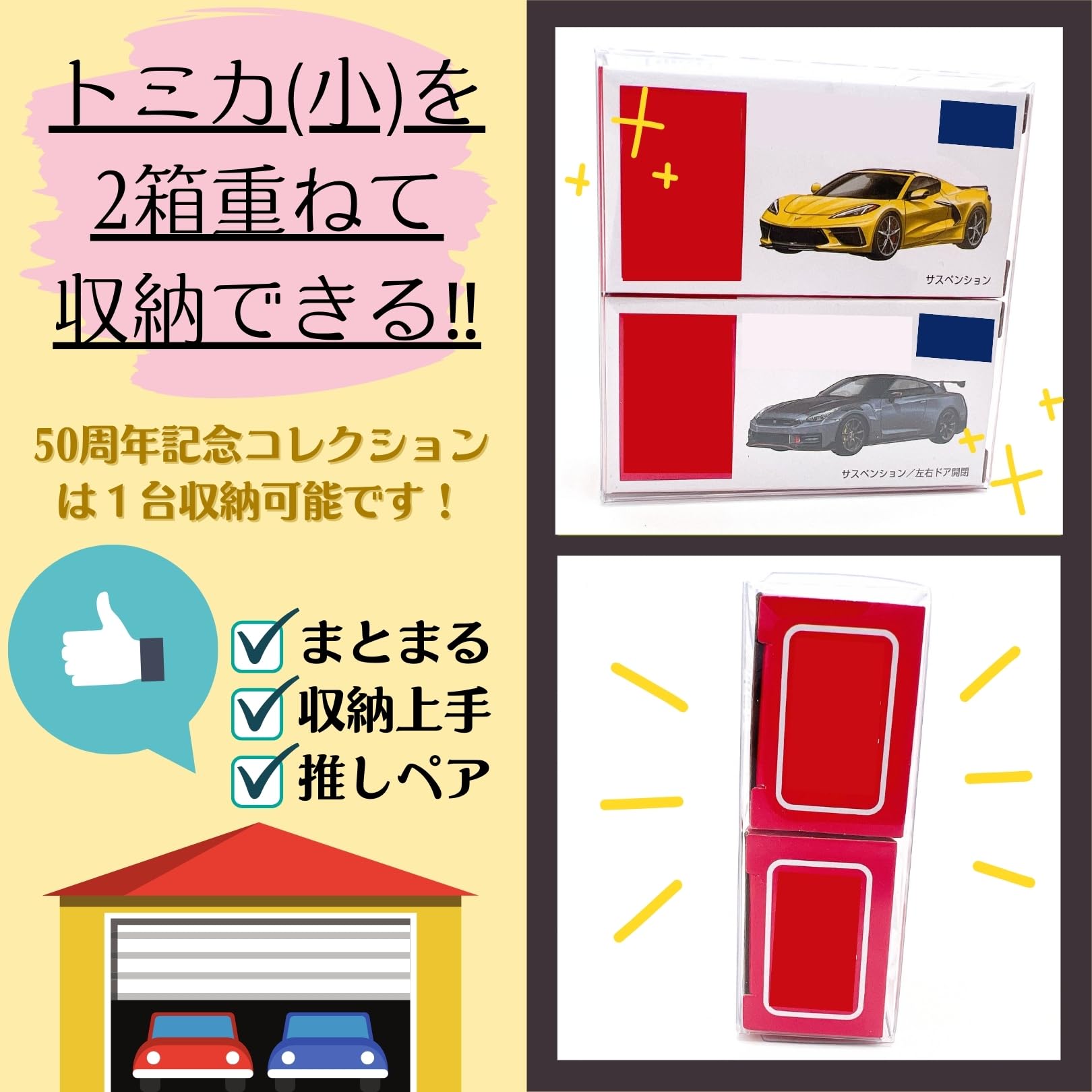 【ワンランク上のディスプレイ】トミカ小サイズの外箱と車本体を上下に重ねて、一緒にディスプレイすることができます。