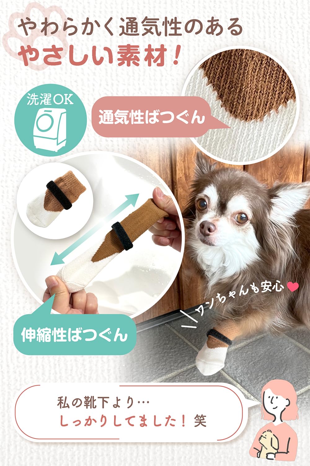 ? 伸縮性と通気性 : 上質なコットンを使用し伸縮性はばつぐん。また、滑り止めもドット模様にすることで通気性を確保しております。犬は肉球から汗をかくので、愛犬のことを思うなら通気性はとても重要です。