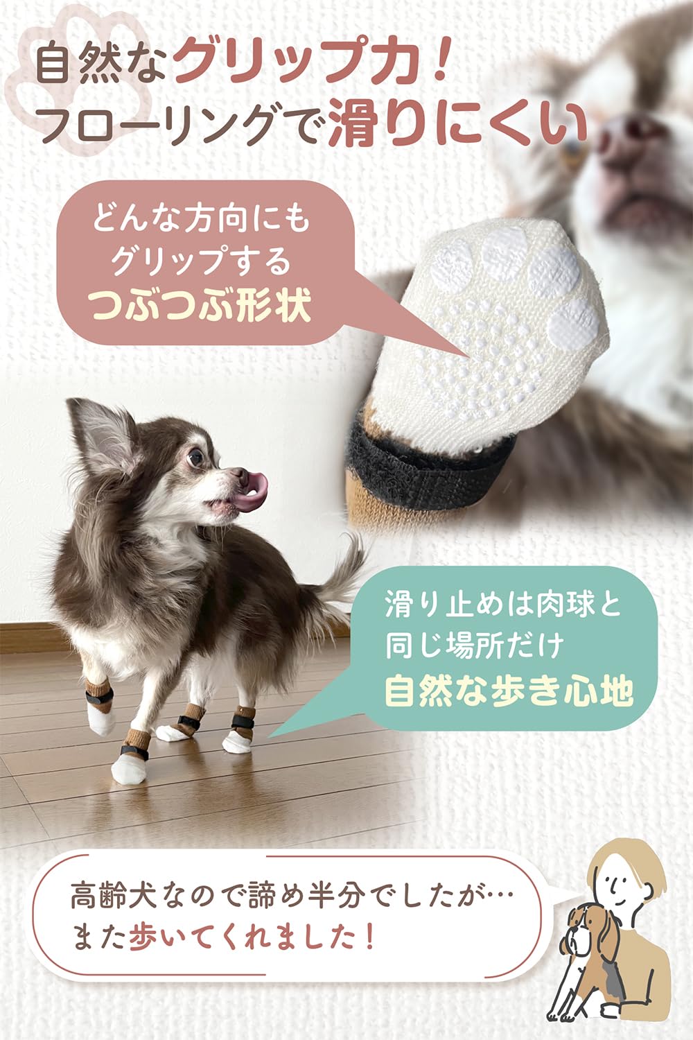 ? 老犬のサポートにも : 老犬や高齢犬など肉球のグリップ力が衰えてきても、靴下の滑り止めで歩けるようにサポート効果も(ご愛犬により効果には個体差があります)。