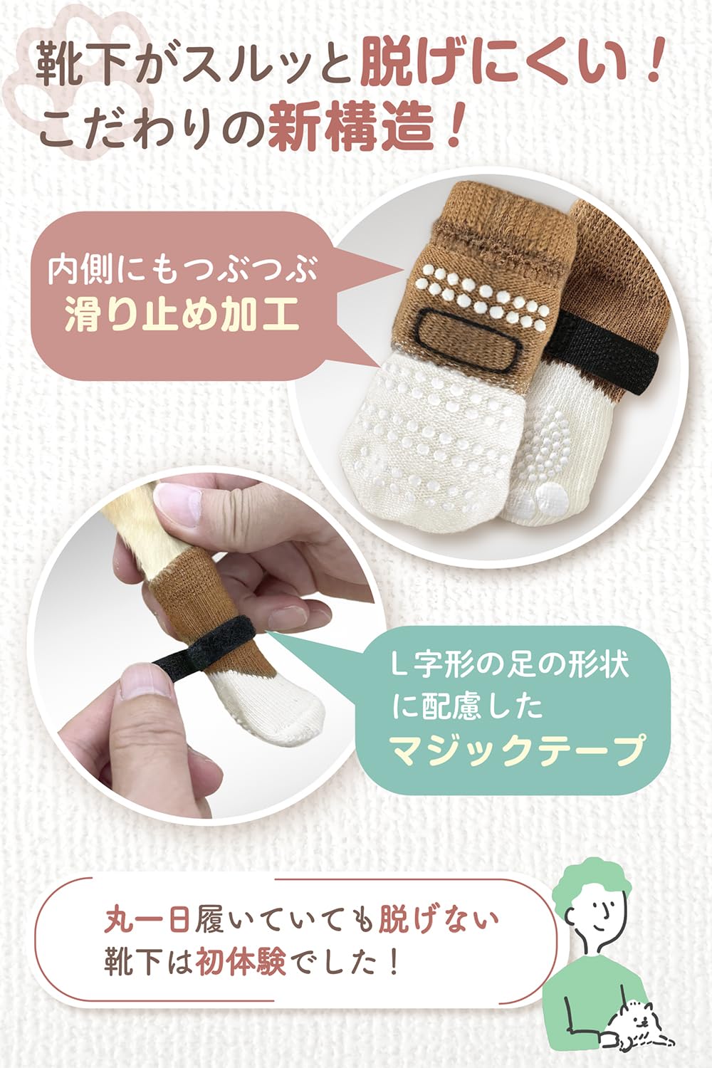 ? [新開発] 靴下がスルッと脱げにくい : 内側にも高品質の滑り止め加工を施したアイデア商品だから犬の足からスルッと脱げにくい(ご愛犬により効果には個体差があります)。着脱可能なマジックテープ付きで更に脱げにくい。