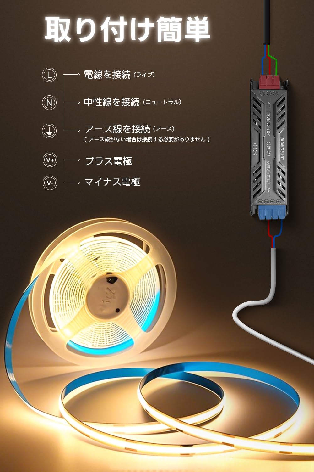 【取り付簡単】両面テープ付き、裏側の保護層を剥がして貼り付けるだけで、取り付けが簡単です。テープライトを使用する前に、対応する電圧のスイッチング電源を接続する必要があります。