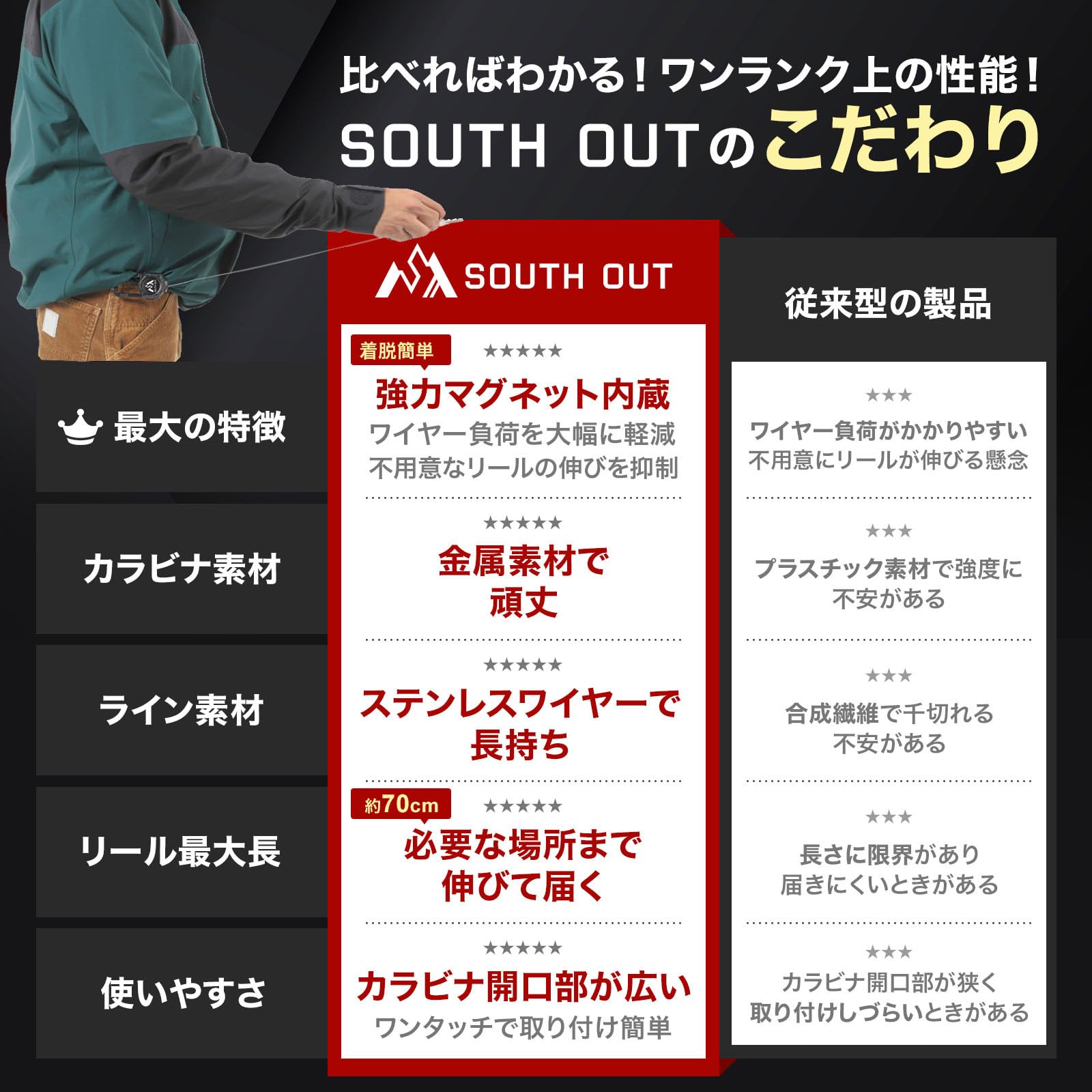 ?【伸びる!届く!ワンタッチ!】伸縮自在な最大70cmの金属製ワイヤー搭載で必要な場所まで伸びる!可動部が360°回転する抜群の取り回しで必要な場所まで届く!上下カラビナ仕様で着脱がお手軽ワンタッチ!